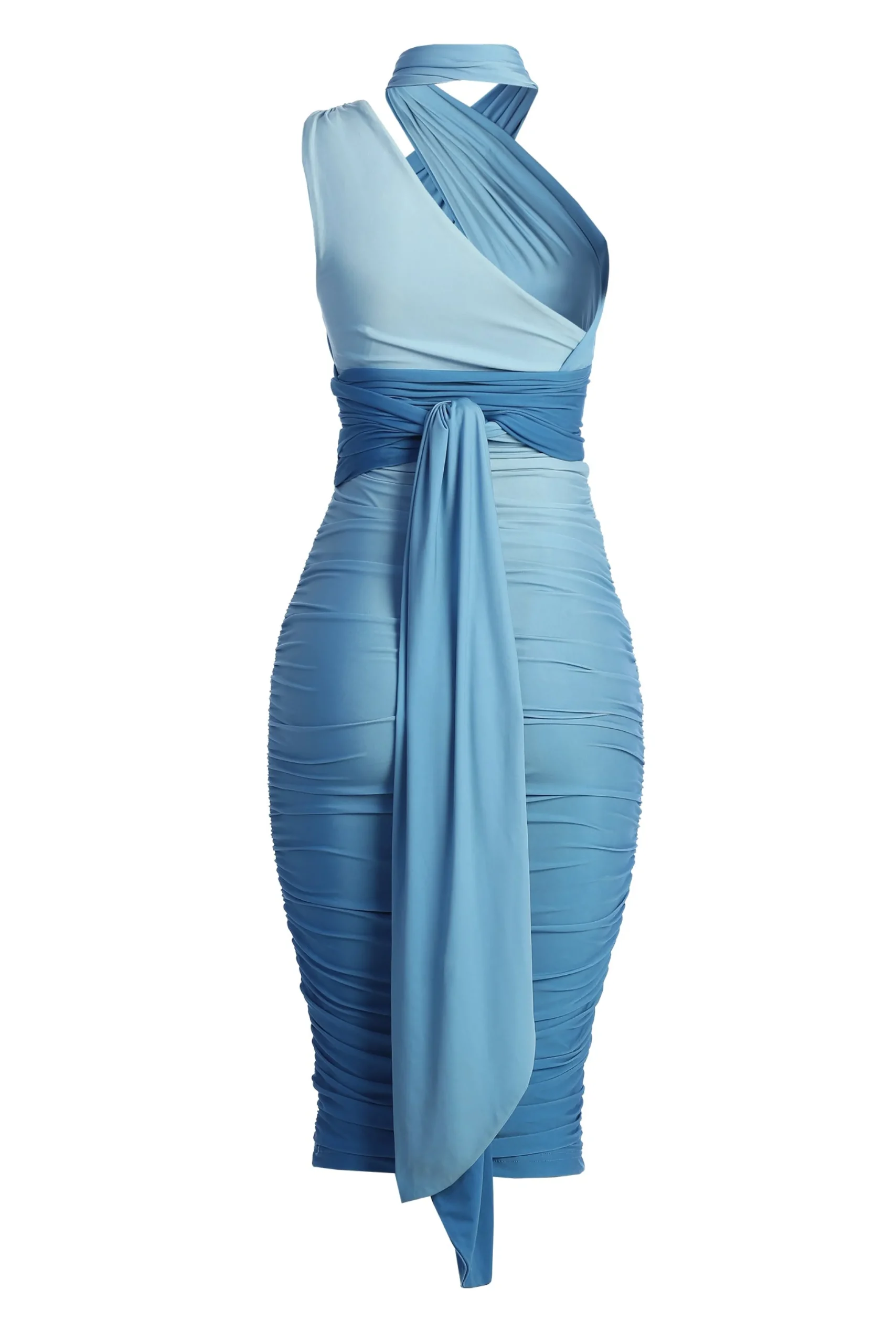 Wrapped to perfection in our Blue Ombre Edge Of Romance Midi Dress. Highlighting a dreamy gradient design, this multi-tie bodycon dress comes with long straps that can be wrapped around your body in different ways to achieve different looks. Beautiful ruching throughout and a stylish side drape heighten the elegance of this occasion ready dress. Stretchy.
