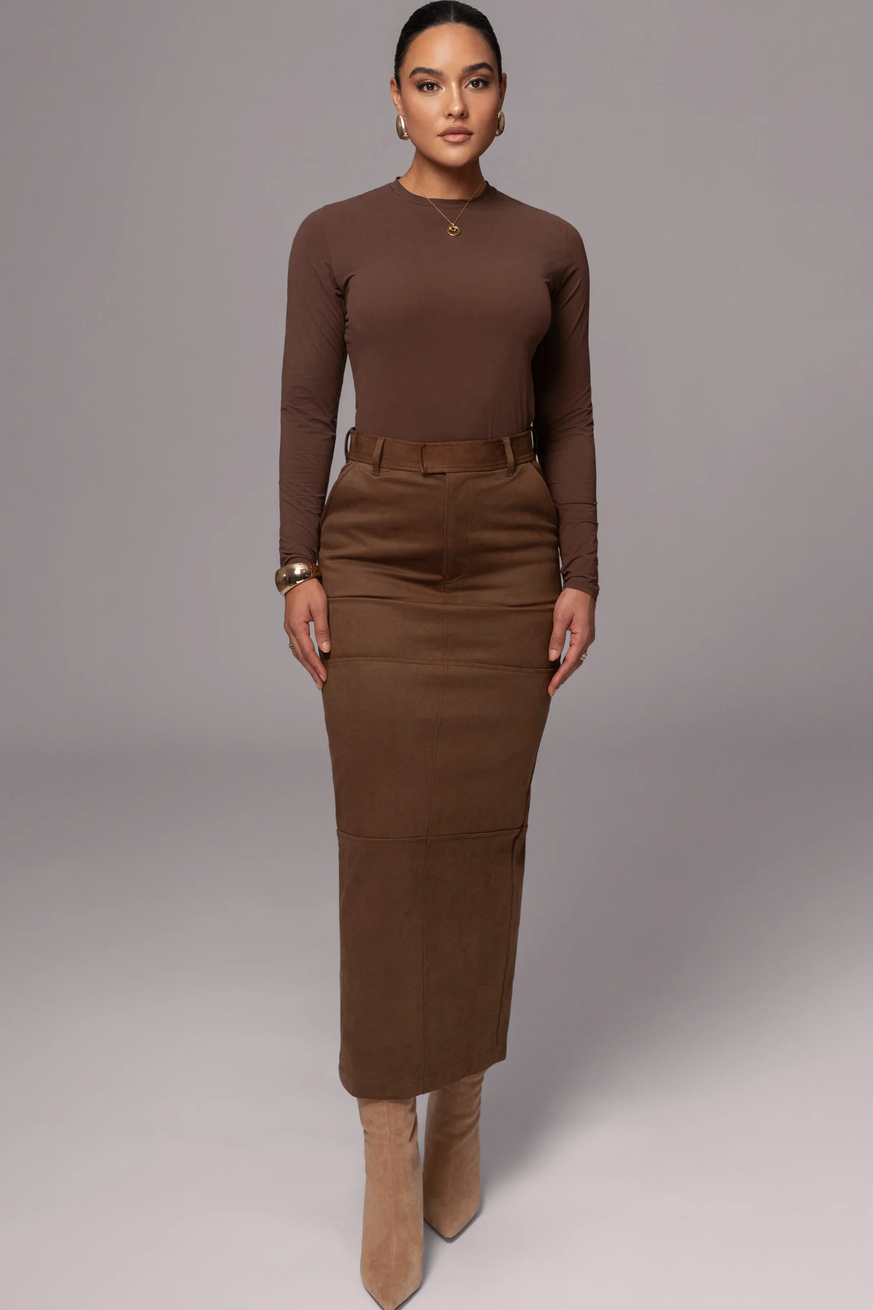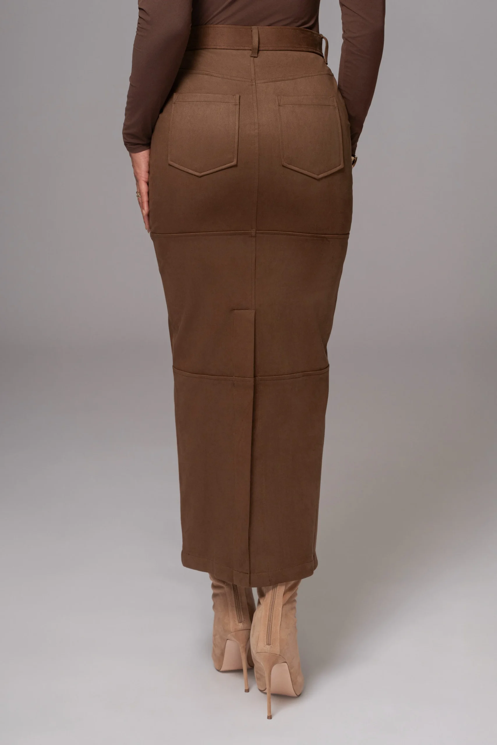 Prepare your wardrobe for winter with our Chocolate Joy Suede Maxi Skirt, crafted from soft suede for the perfect seasonal touch. This high-waisted skirt features functional side and back pockets, a front zipper with a clasp closure, horizontal seams for added detail, and belt loops for added practicality.Pair with our Elite Suede Coat for the full look. Single lined. No stretch.
