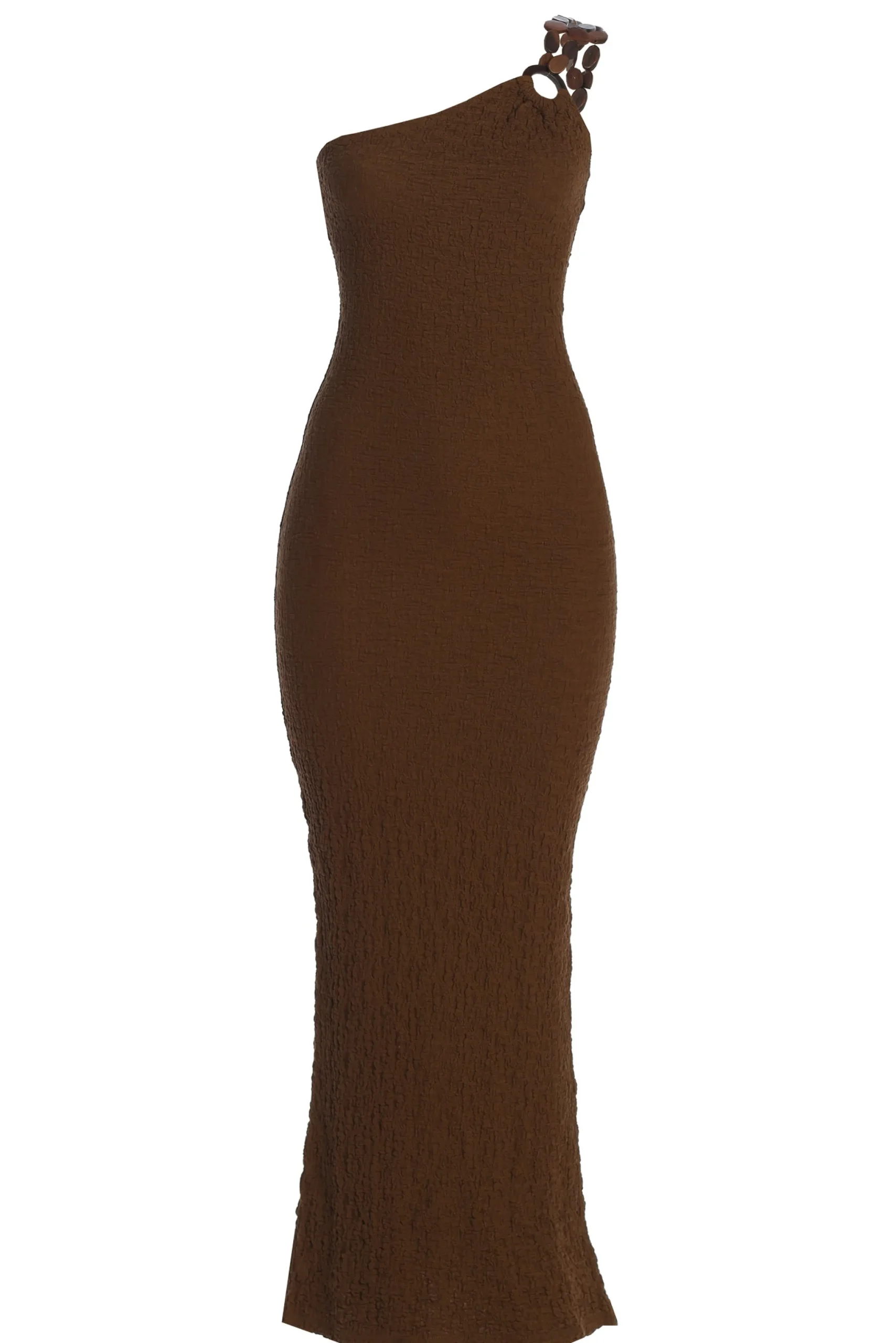 Our new Chocolate Summer In Capri Dress is perfect for your summer getaway. Crafted from lightweight crinkled fabric, it features a unique wooden keyhole at the shoulder and removable wooden chain straps. Hidden back zipper closure. Minimal stretch.