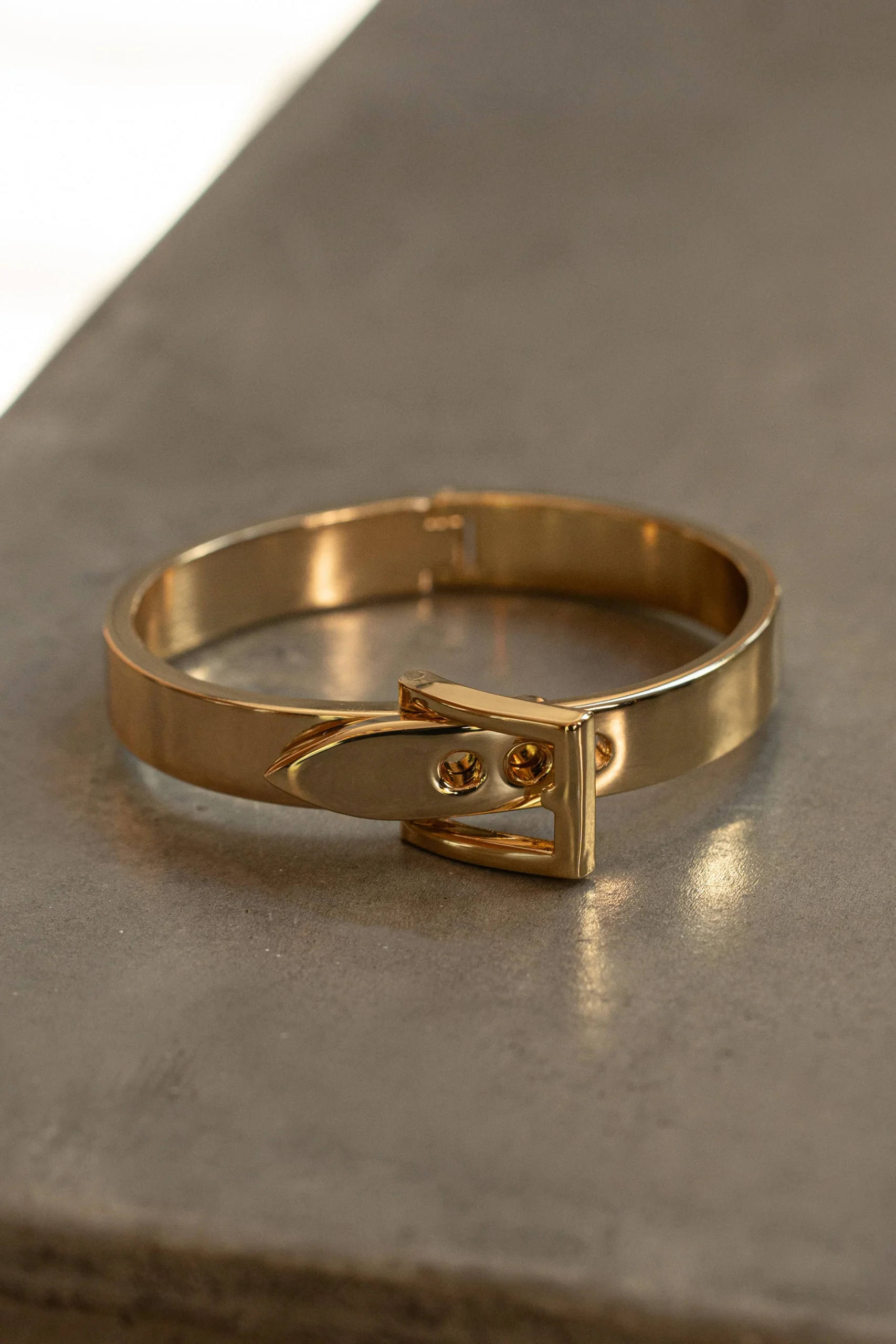 Indulge in luxury with our Gold Belt Buckle Bracelet. Crafted with a gold-tone hinge and center belt buckle detail, this hinge bracelet exudes sophistication and exclusivity.