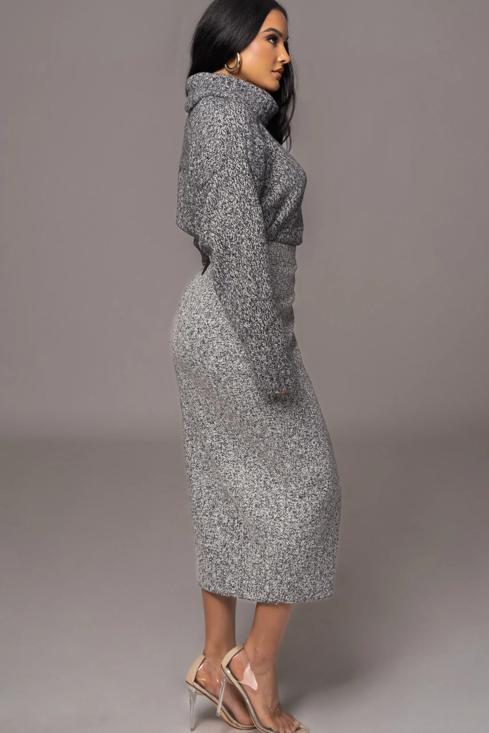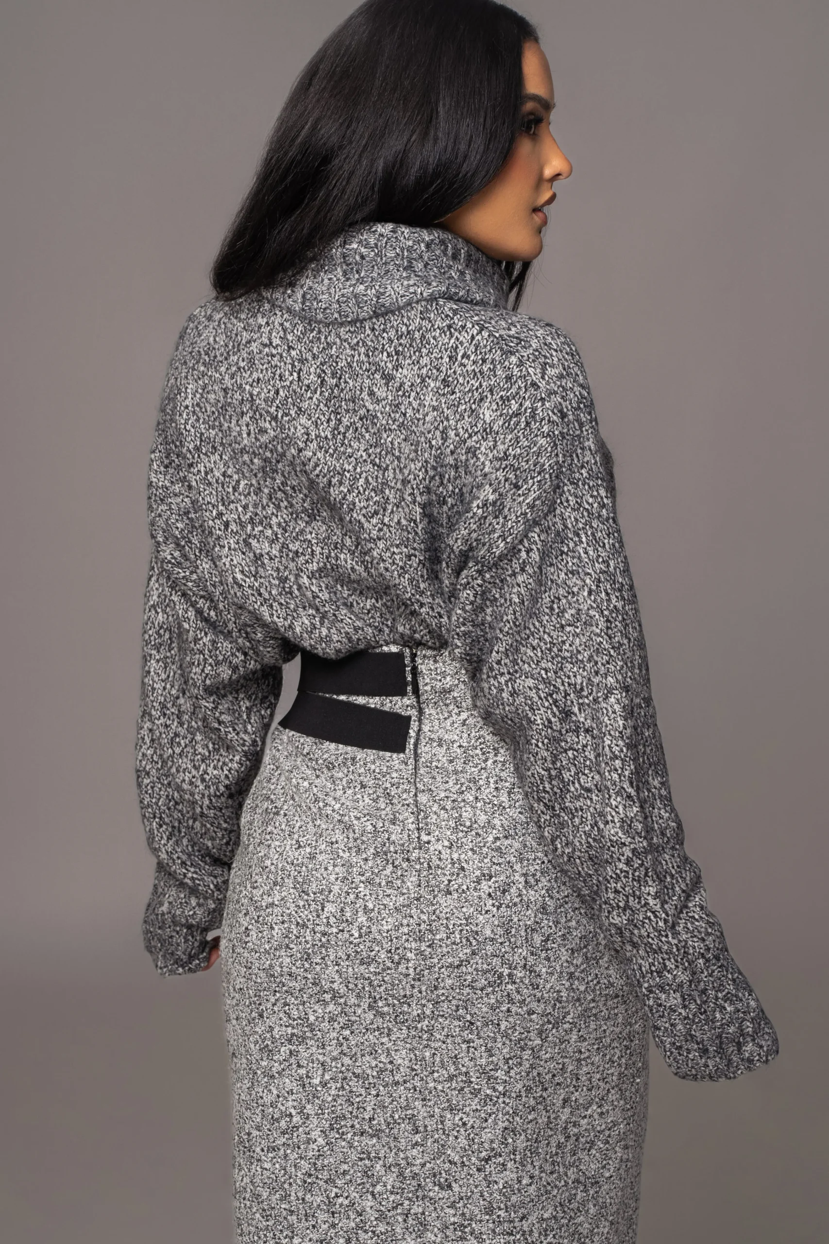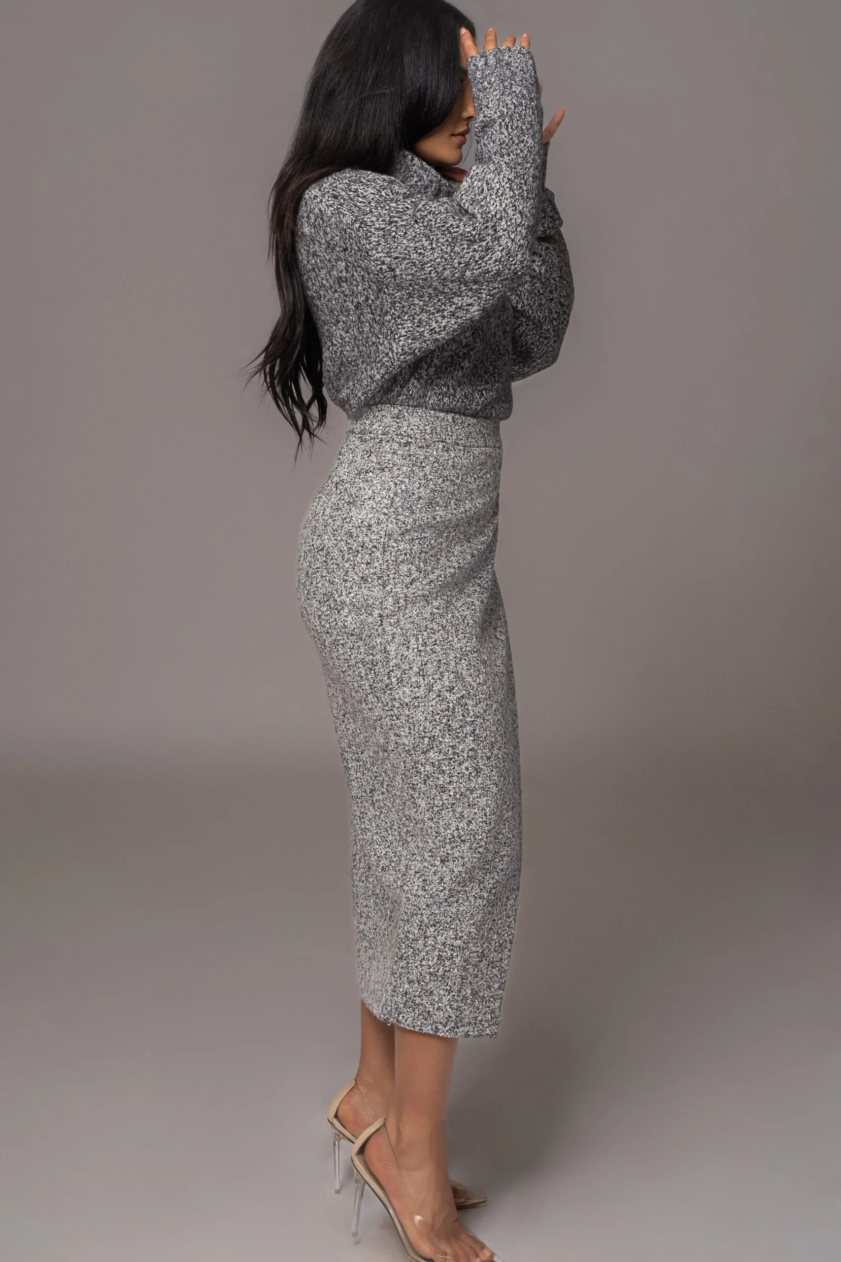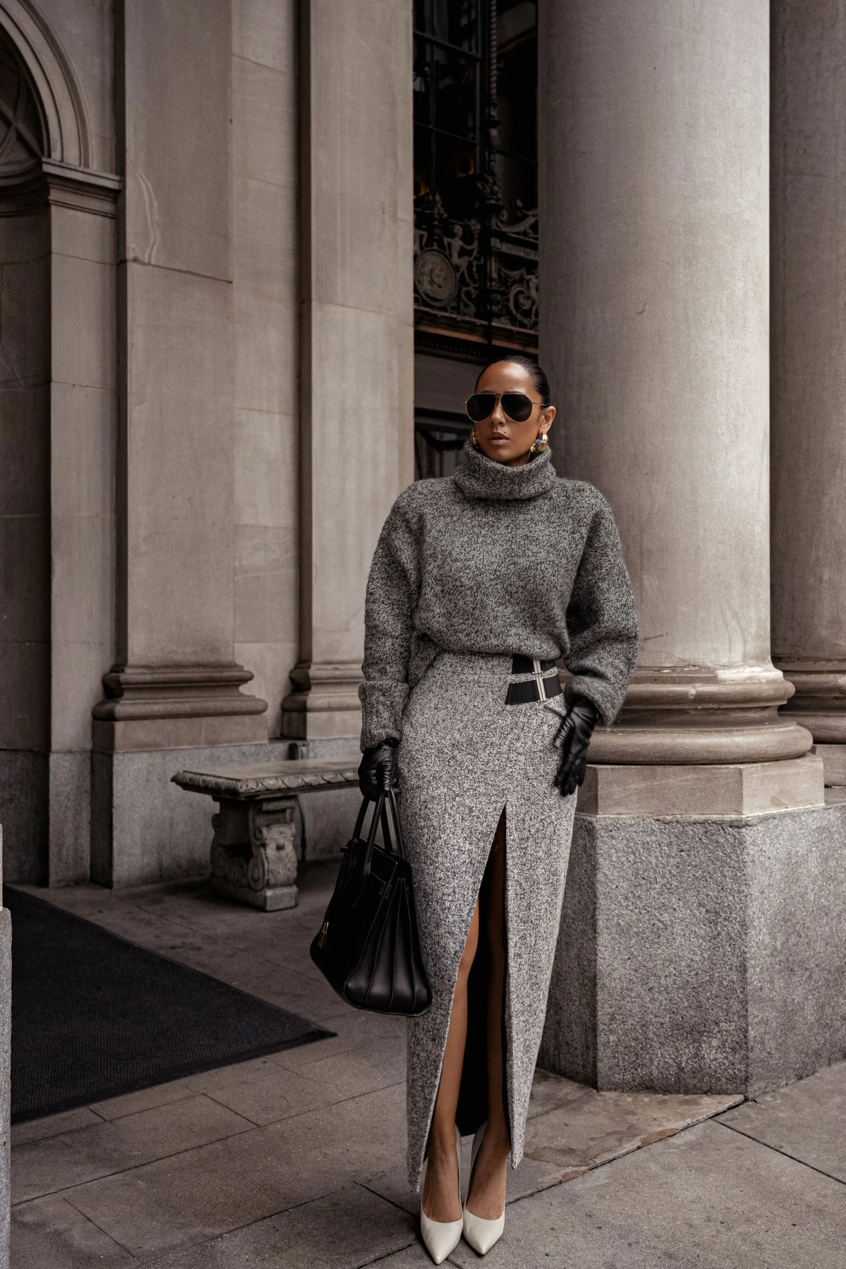 Upgrade your Fall wardrobe with our Grey Beginnings Sweater Knit Turtleneck. Crafted in a thick knit material offering a cozy feel, while ribbed trims and a relaxed fit ensure style and comfortable. Pair with our Gisele Tweed Slit Skirt for the full look. Single lined.