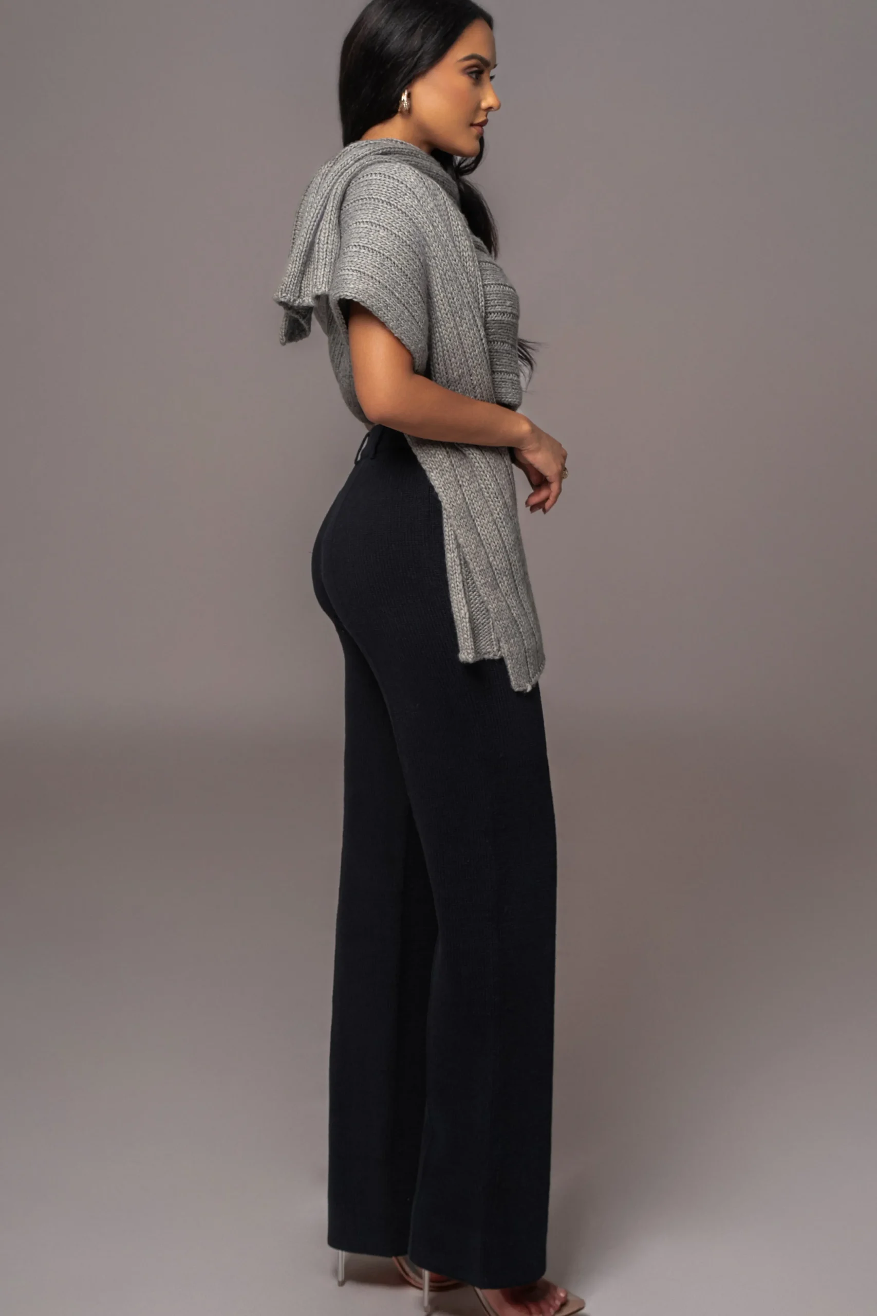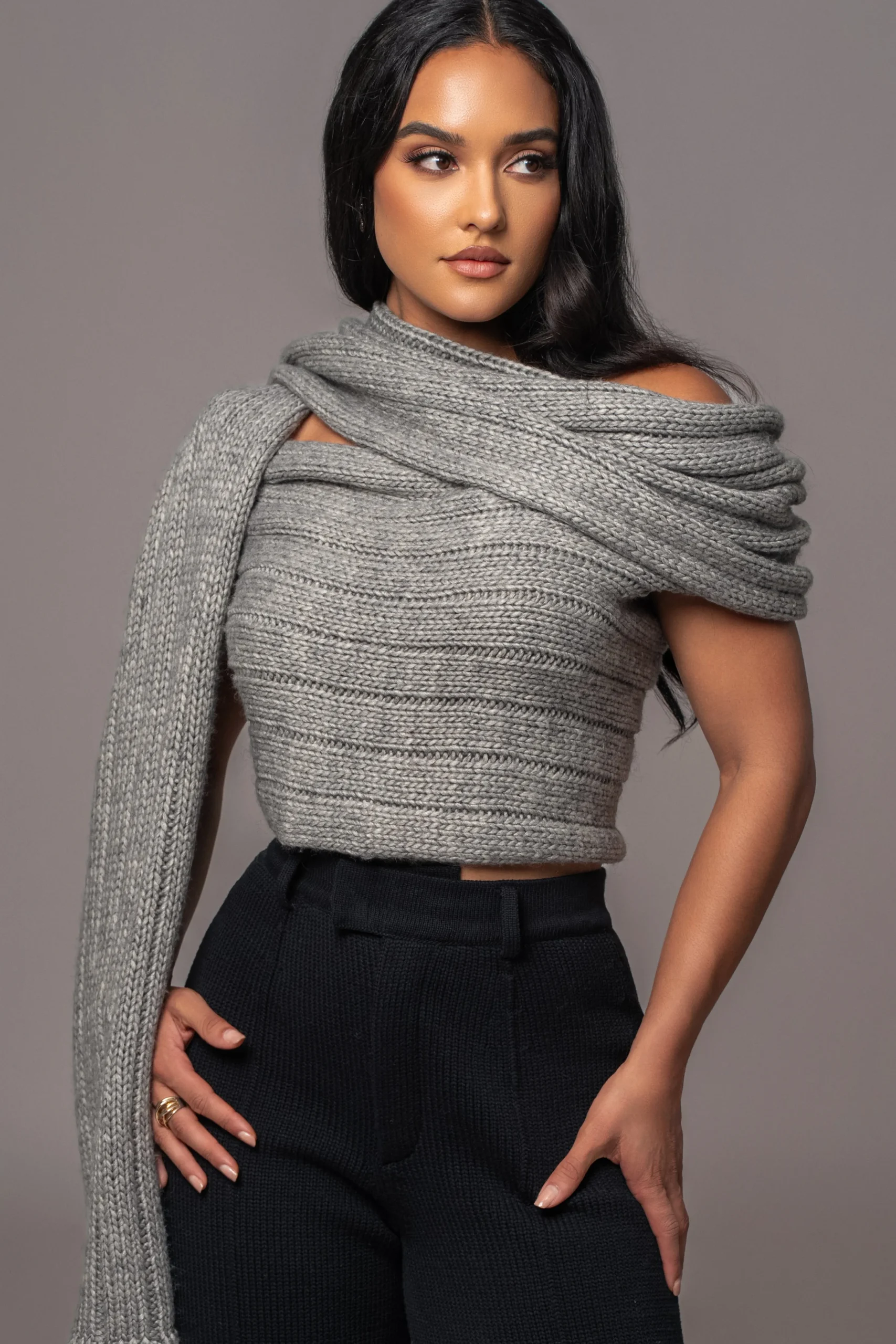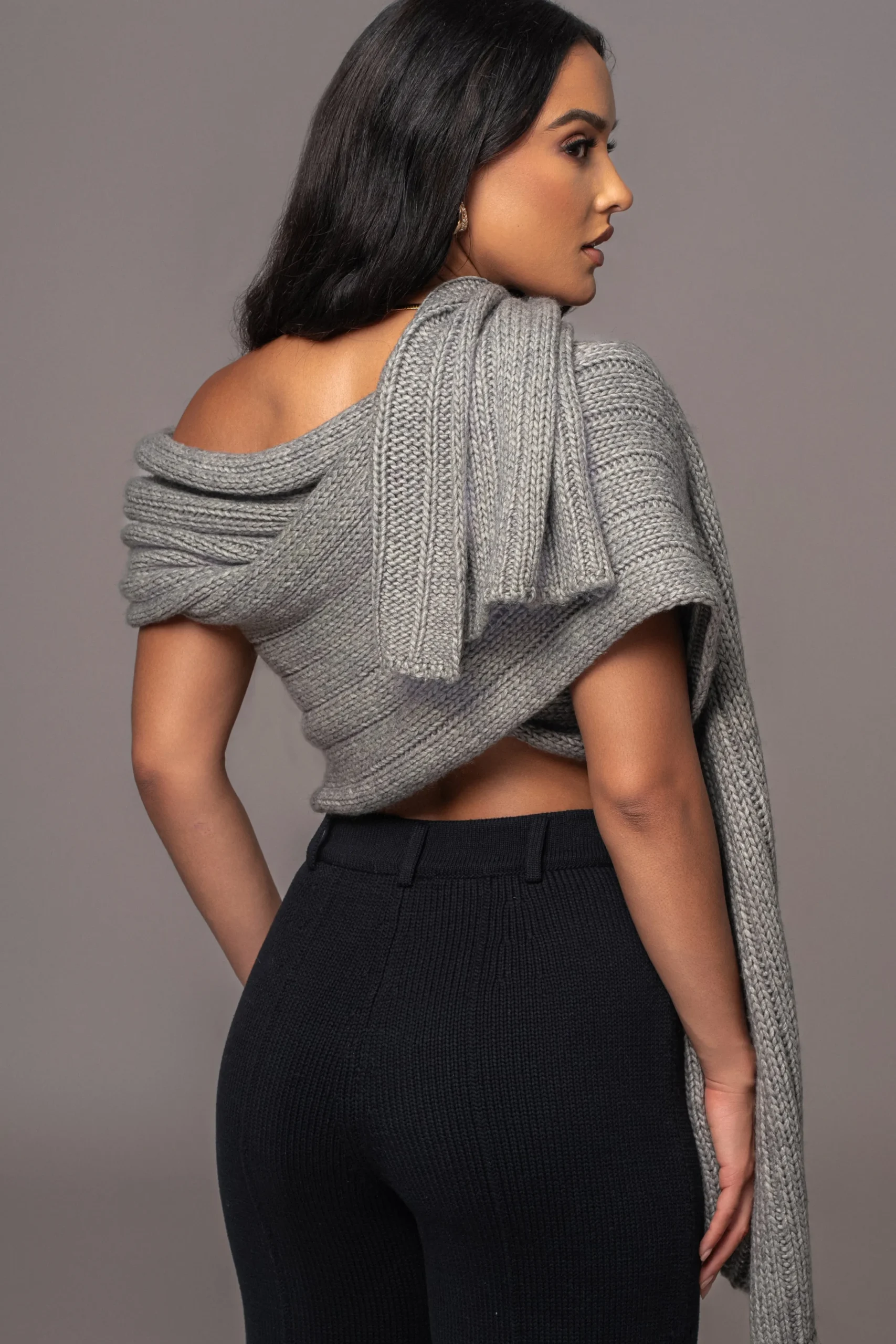 Enhance your Fall wardrobe with our Grey Soft Life Sweater Knit Cable Top, designed for limitless styling options. Crafted from a soft cable knit fabric, this versatile wrap top allows for multiple styling variations, including a scarf-inspired neckline that elegantly drapes across the front. Pair with our Take Me Home Ribbed Skirt or Power Hour High Waist Trousers for a full look. Stretchy. Single lined.