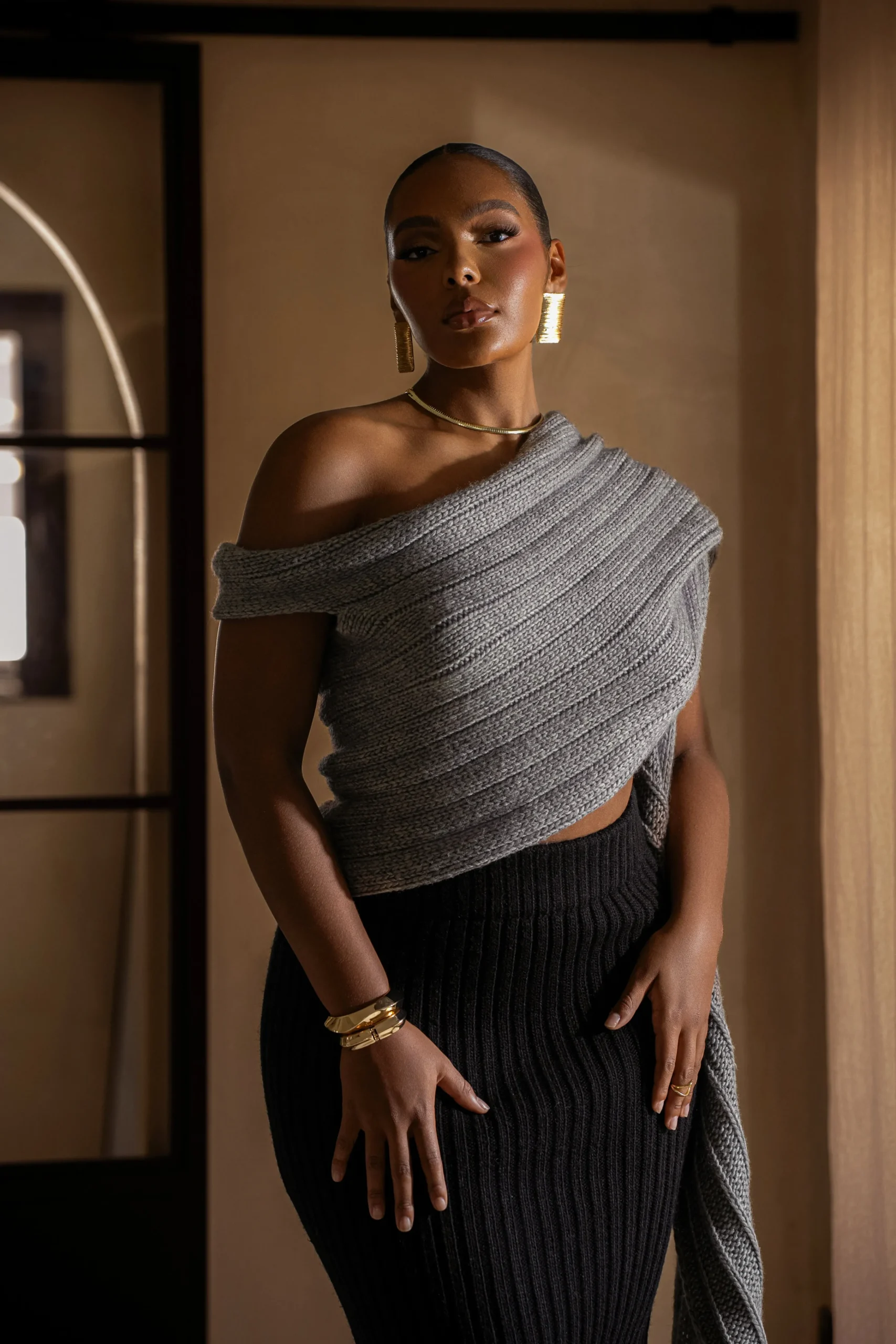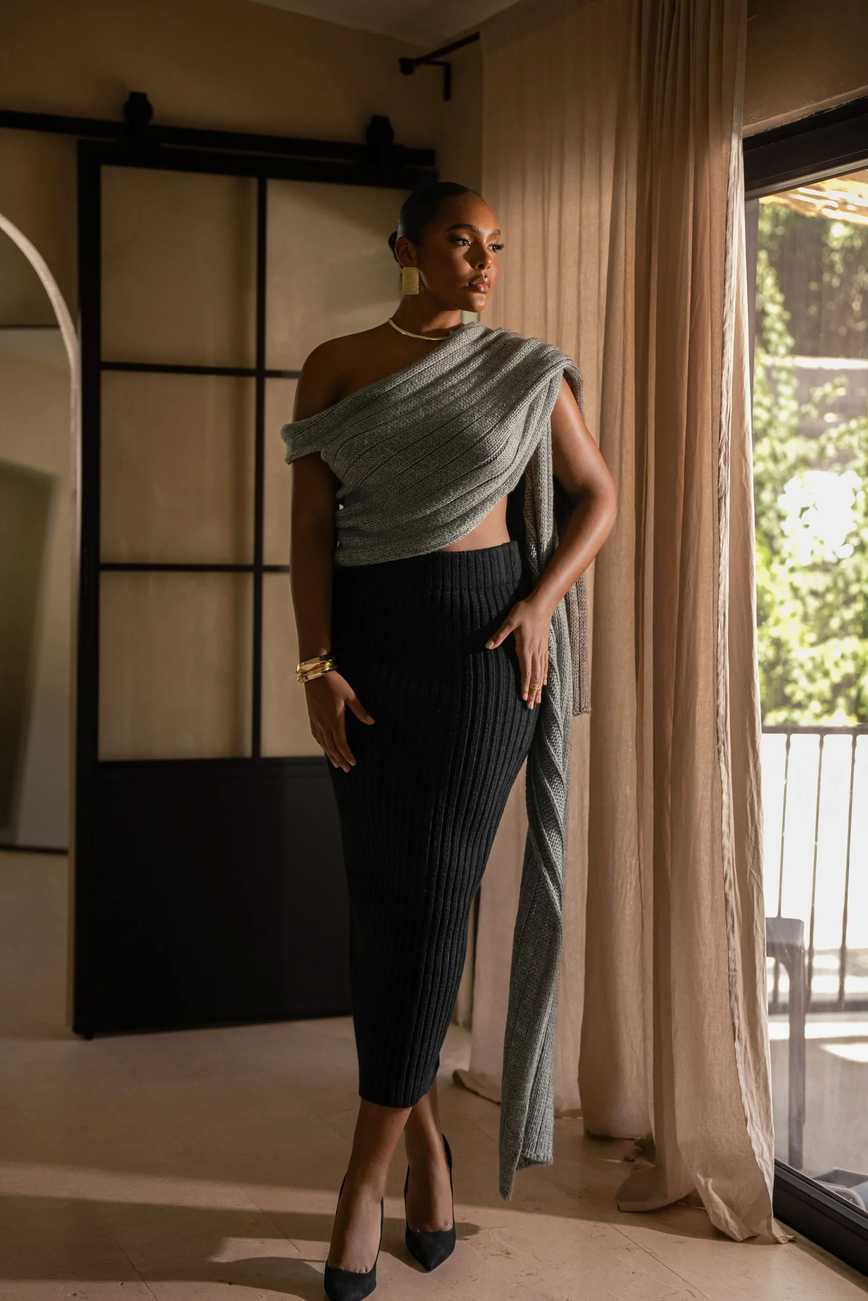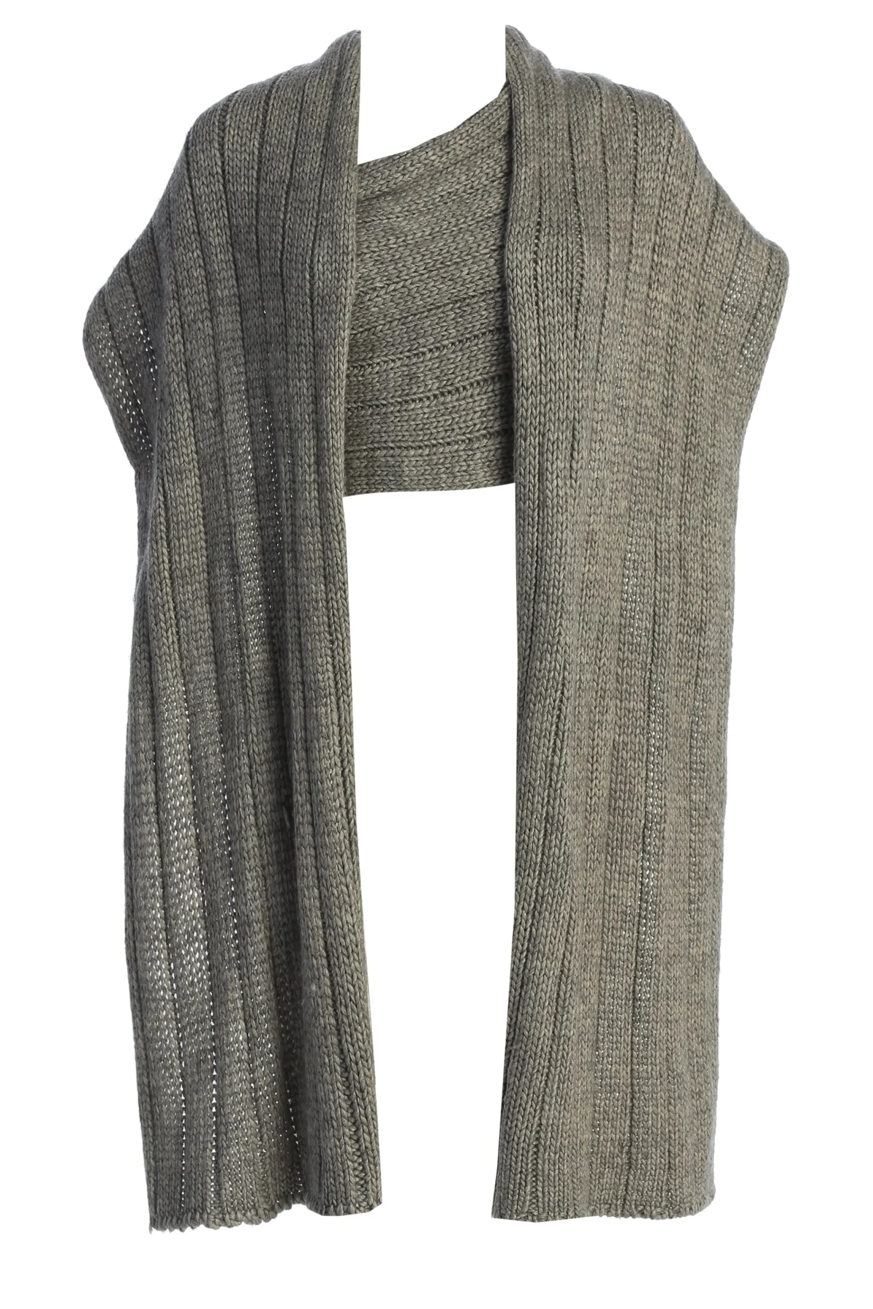 Enhance your Fall wardrobe with our Grey Soft Life Sweater Knit Cable Top, designed for limitless styling options. Crafted from a soft cable knit fabric, this versatile wrap top allows for multiple styling variations, including a scarf-inspired neckline that elegantly drapes across the front. Pair with our Take Me Home Ribbed Skirt or Power Hour High Waist Trousers for a full look. Stretchy. Single lined.