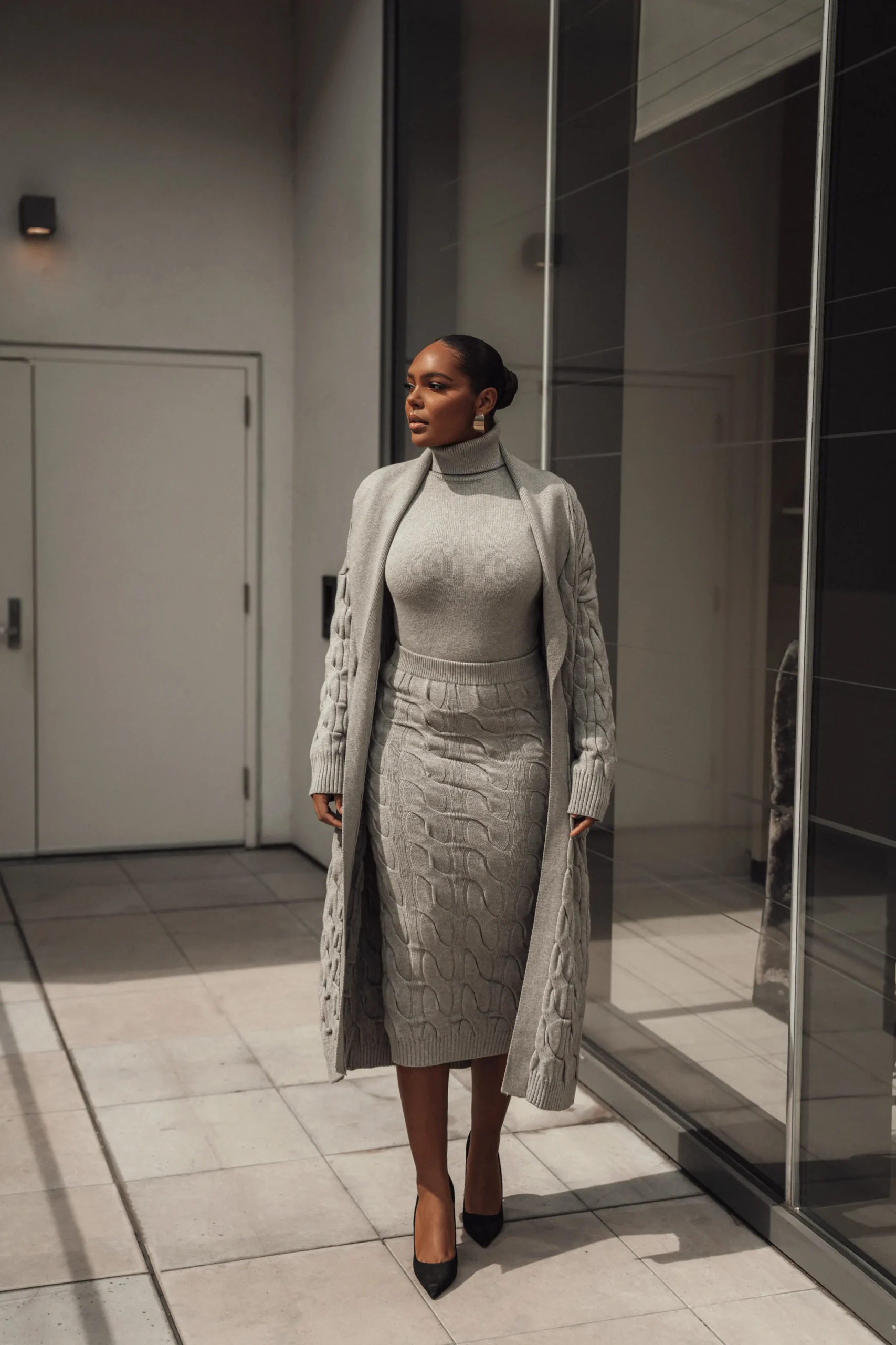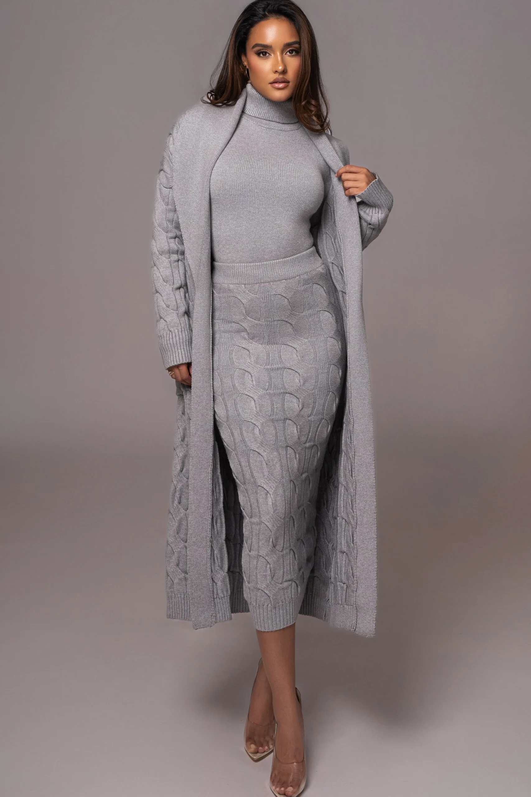 Wrap yourself in warmth and style with our Grey Stepping Out Sweater Cardigan. This longline cardigan features a luxurious cable-knit pattern with shawl collar, ribbed cuff sleeves, and two functional welt pockets. Pair with our Take Notice Top and Timeless Midi Skirt for the full look. Stretchy. Oversized.