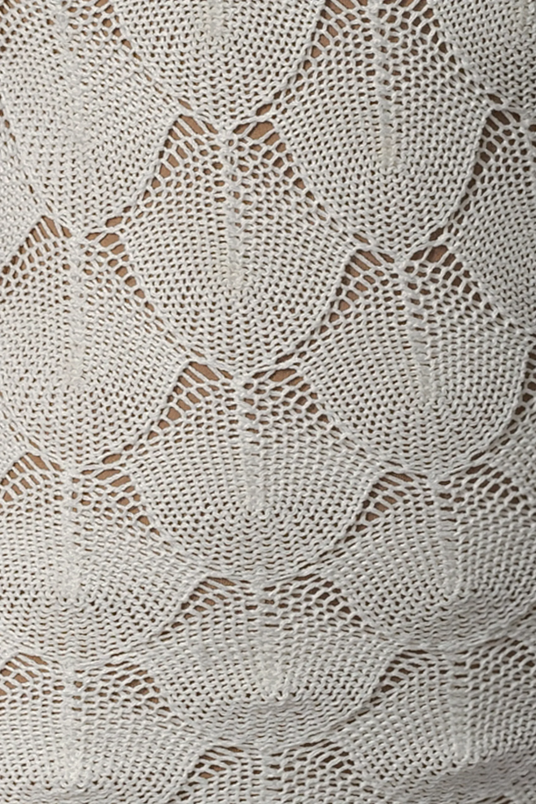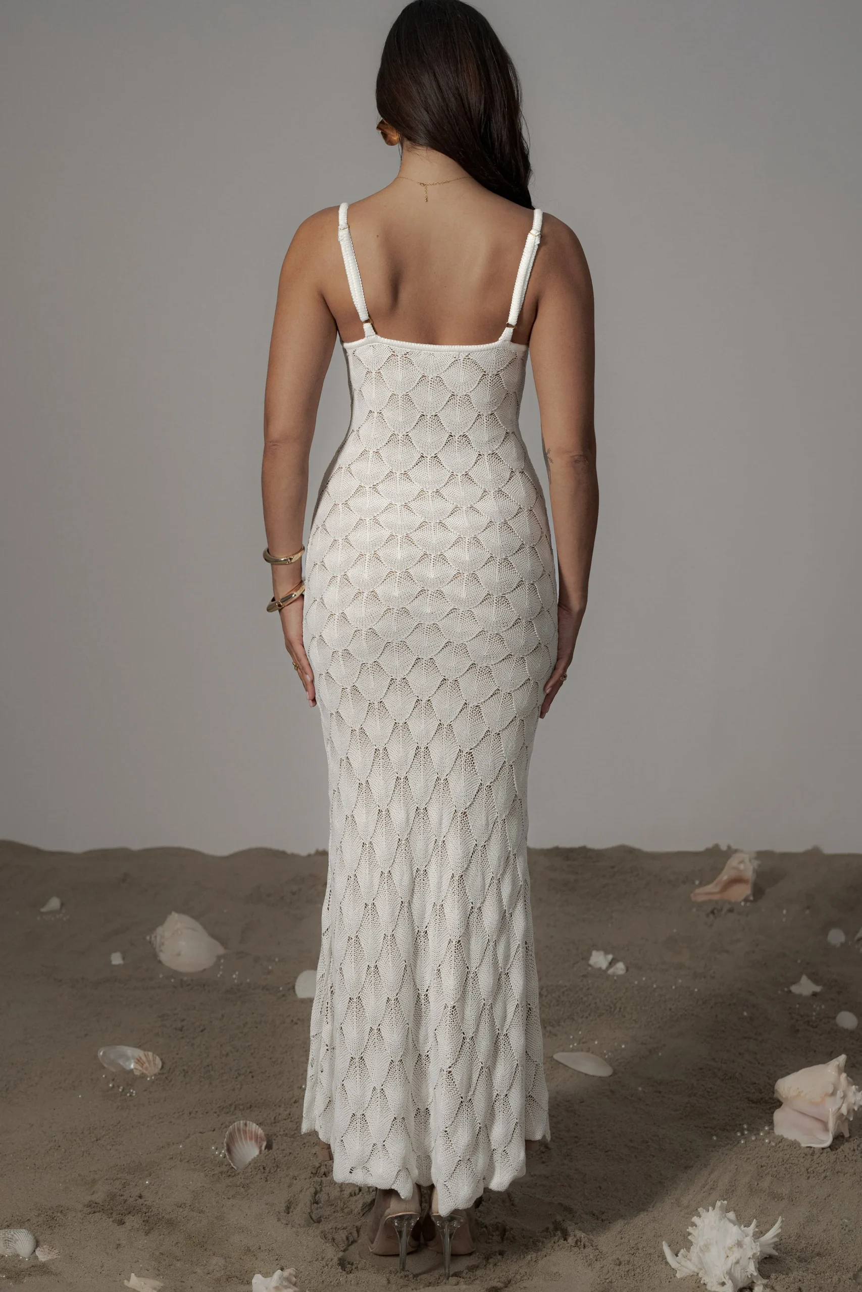 Create magical moments under the sun in our new Ivory Gabriela Knit Maxi Dress. Crafted in a knit fabric with seashell shaped pattern, this maxi dress features a fitted silhouette with a soft V neckline, and adjustable shoulder straps. A nude lined interior with flared sweep finishes the look. Double lined. Stretchy.