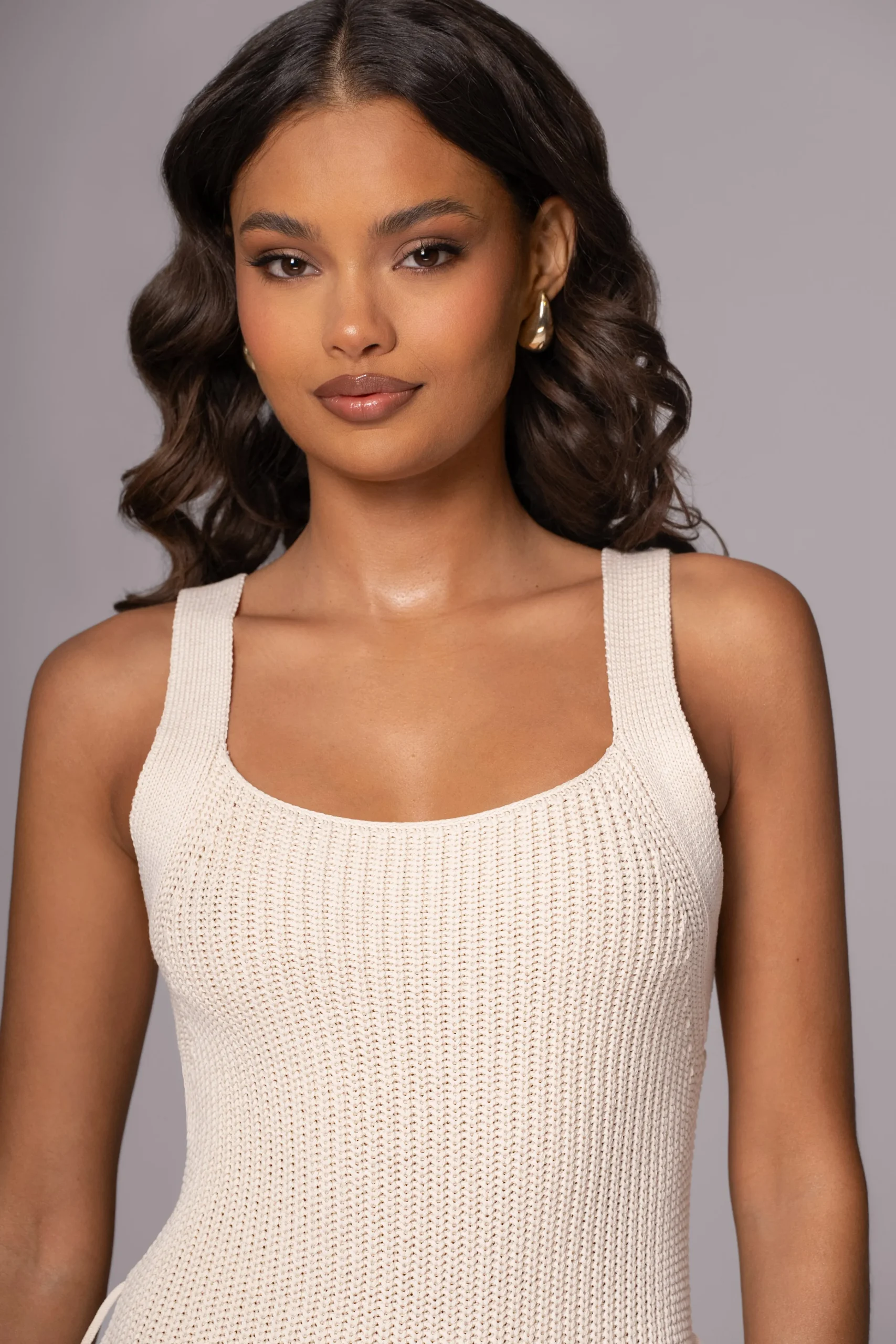 Introducing the dress of summer, our Ivory Moonrise Ribbed Maxi Dress. One of our most loved skirt set has been redesigned in a modern midi dress for a touch of sophistication. Made from a soft knit material, this dress boasts a round neckline, fixed shoulder straps, and a matching bamboo buckle waist belt for a flattering silhouette. Perfect for any occasion, exuding both style and comfort. Stretchy. Single lined.