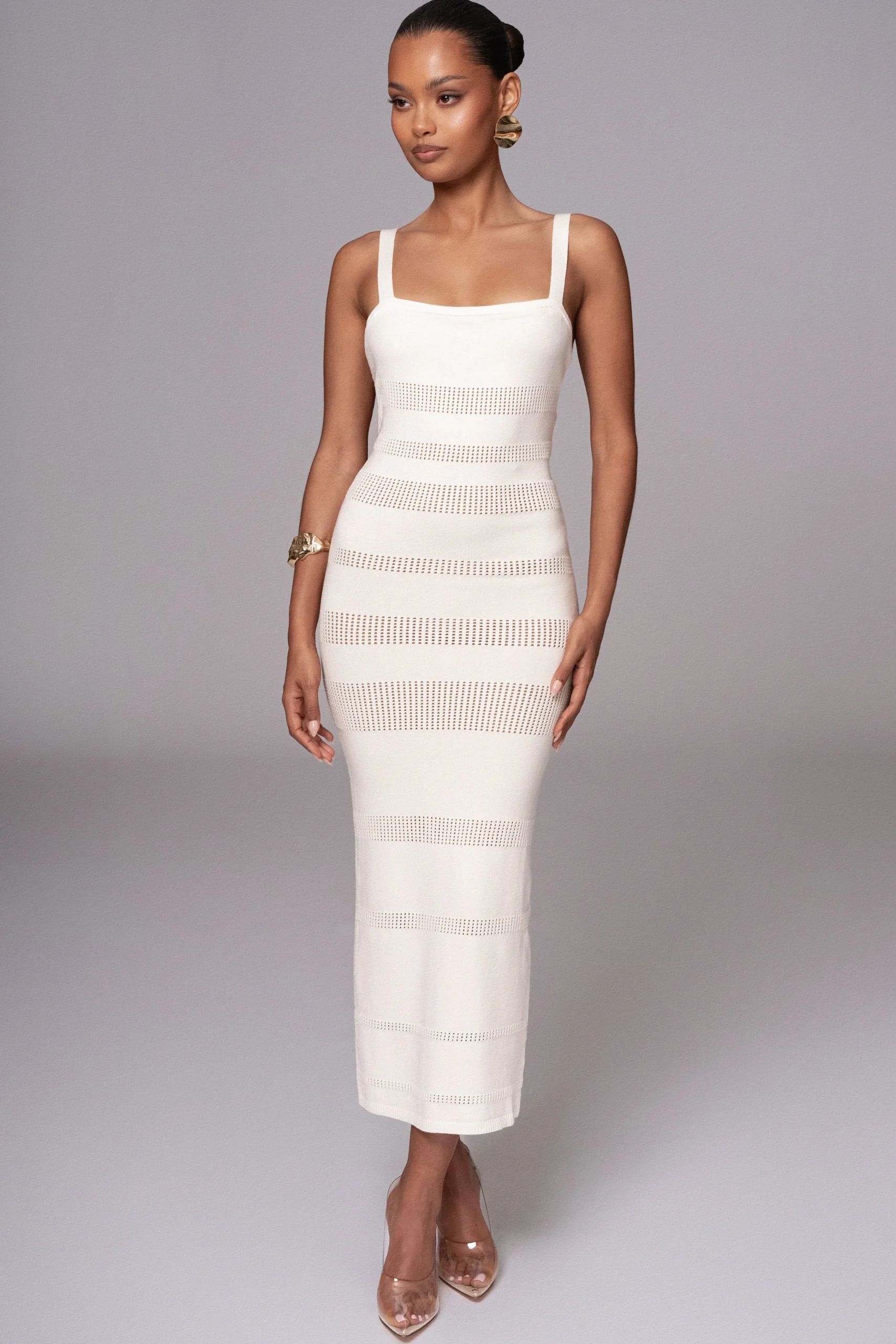 Dive into the essence of summer with our Ivory Sandy Shores Knit Midi Dress. Made from a stretch knit material, this midi dress boasts a round neckline and fixed shoulder straps that lace up at the back. With nude underlining for coverage and comfort, this dress is both elegant and comfortable.