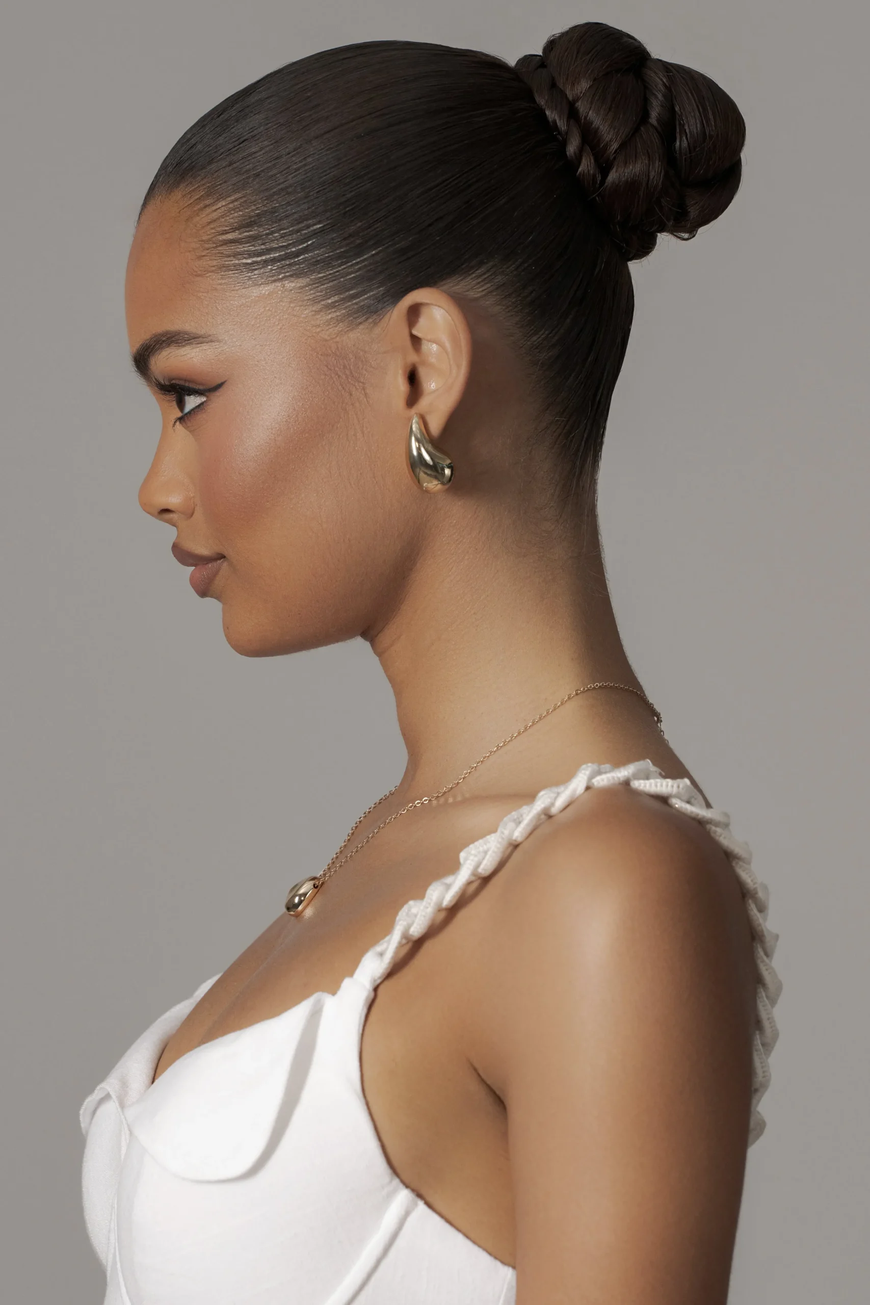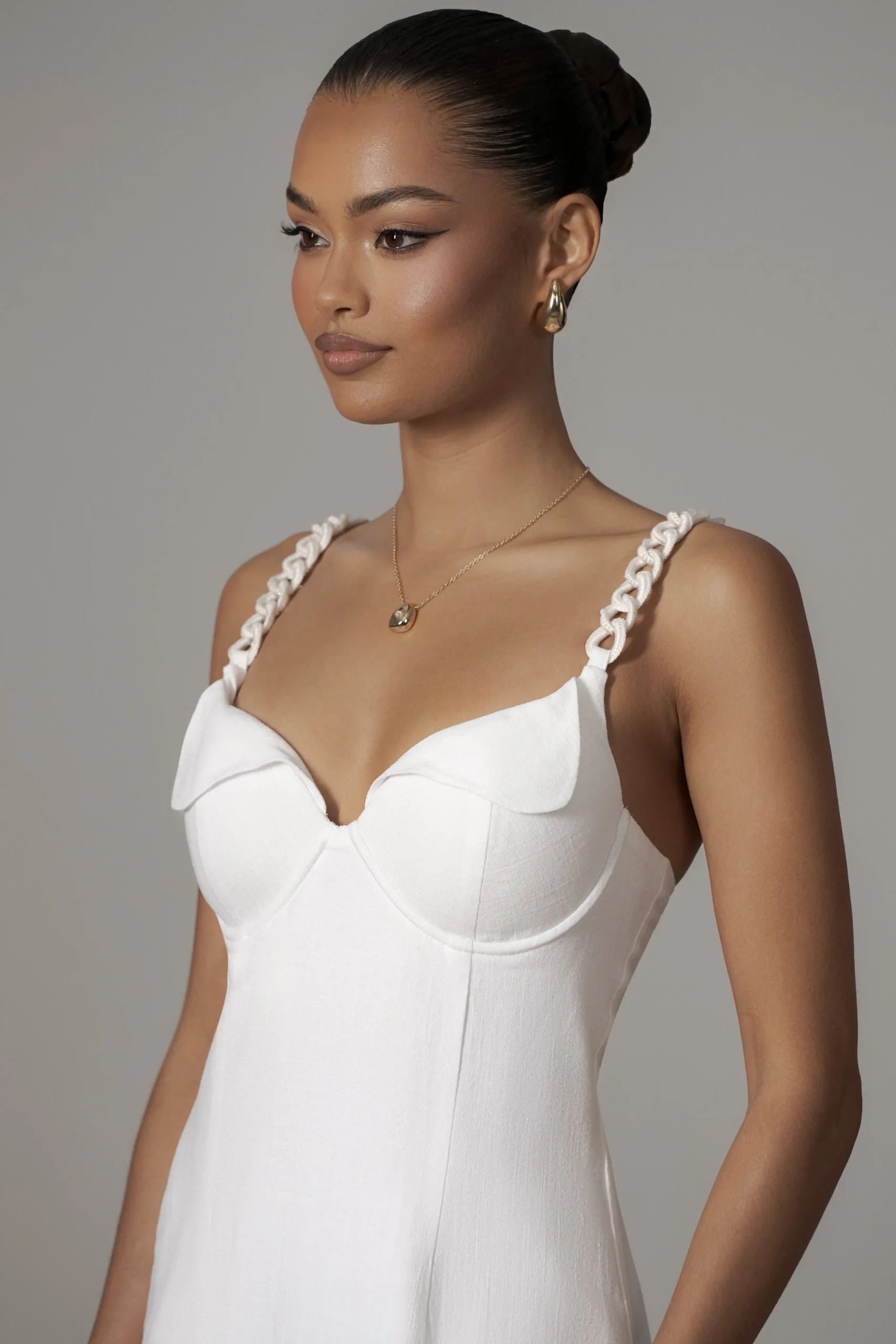 Escape in luxury with our Ivory Secret Hideout Linen Dress. Perfect for any occasion, this midi dress features a beautifully shaped fold over bust line, yarn-covered chain straps, and padded/wired bra cups. It’s finished with a hidden back zipper closure and a back-slit hem. Crafted from a fresh linen blend, perfect for summer outings. No stretch. Double lined.