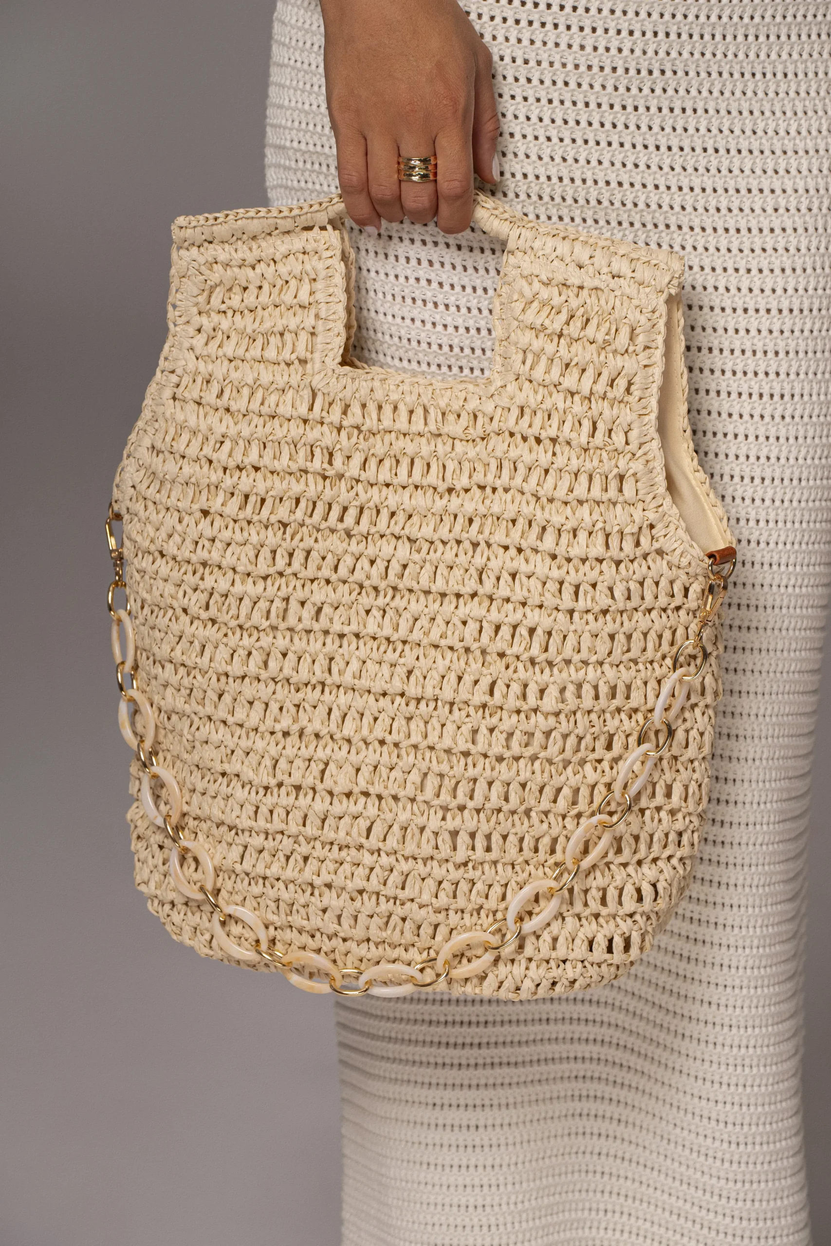 Take a walk along the beach with our Ivory Tropica Handbag. Featuring a woven design with two handles and an acrylic crossbody chain strap, this bag is perfect for the season. Complete with two inside pockets and top closure.