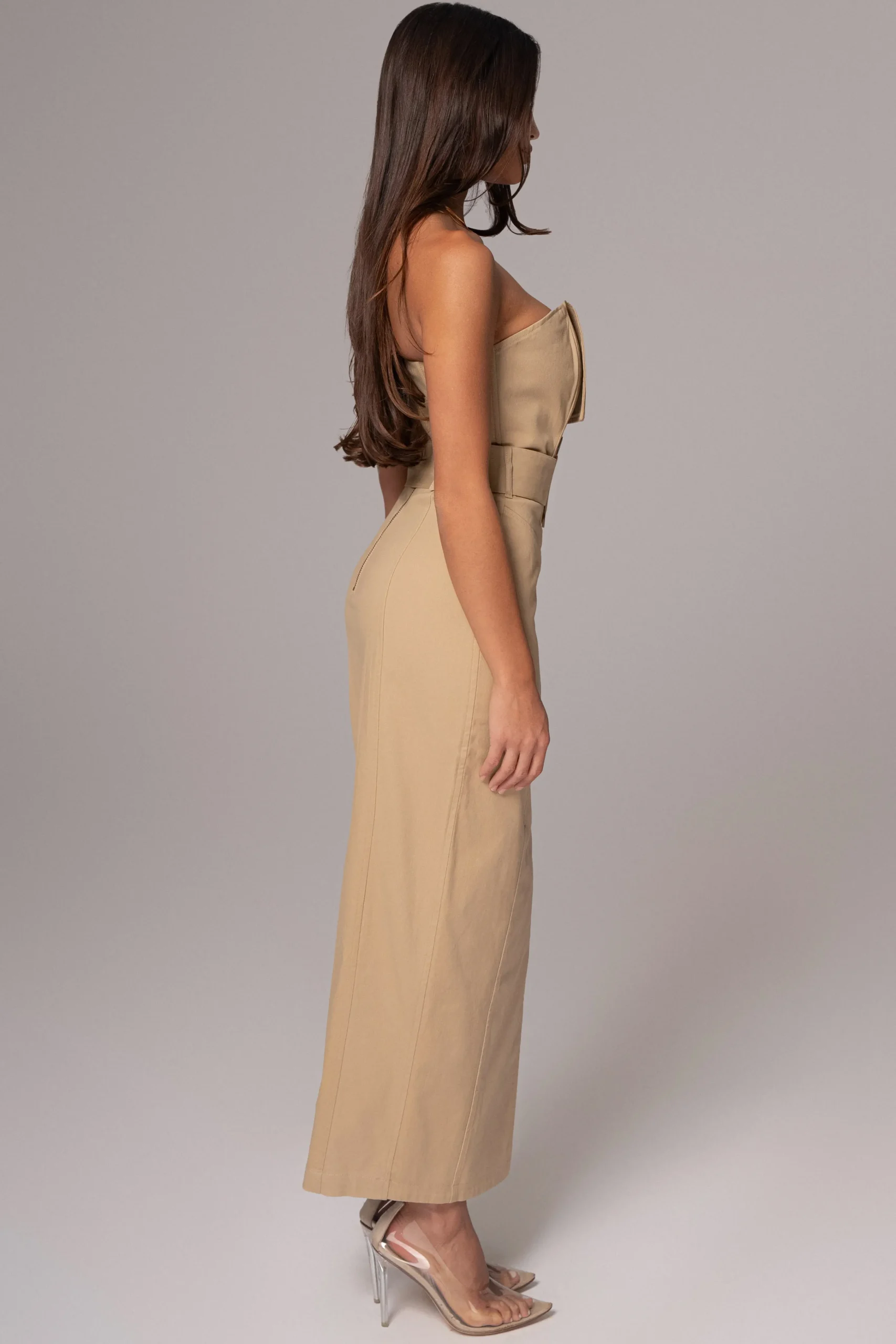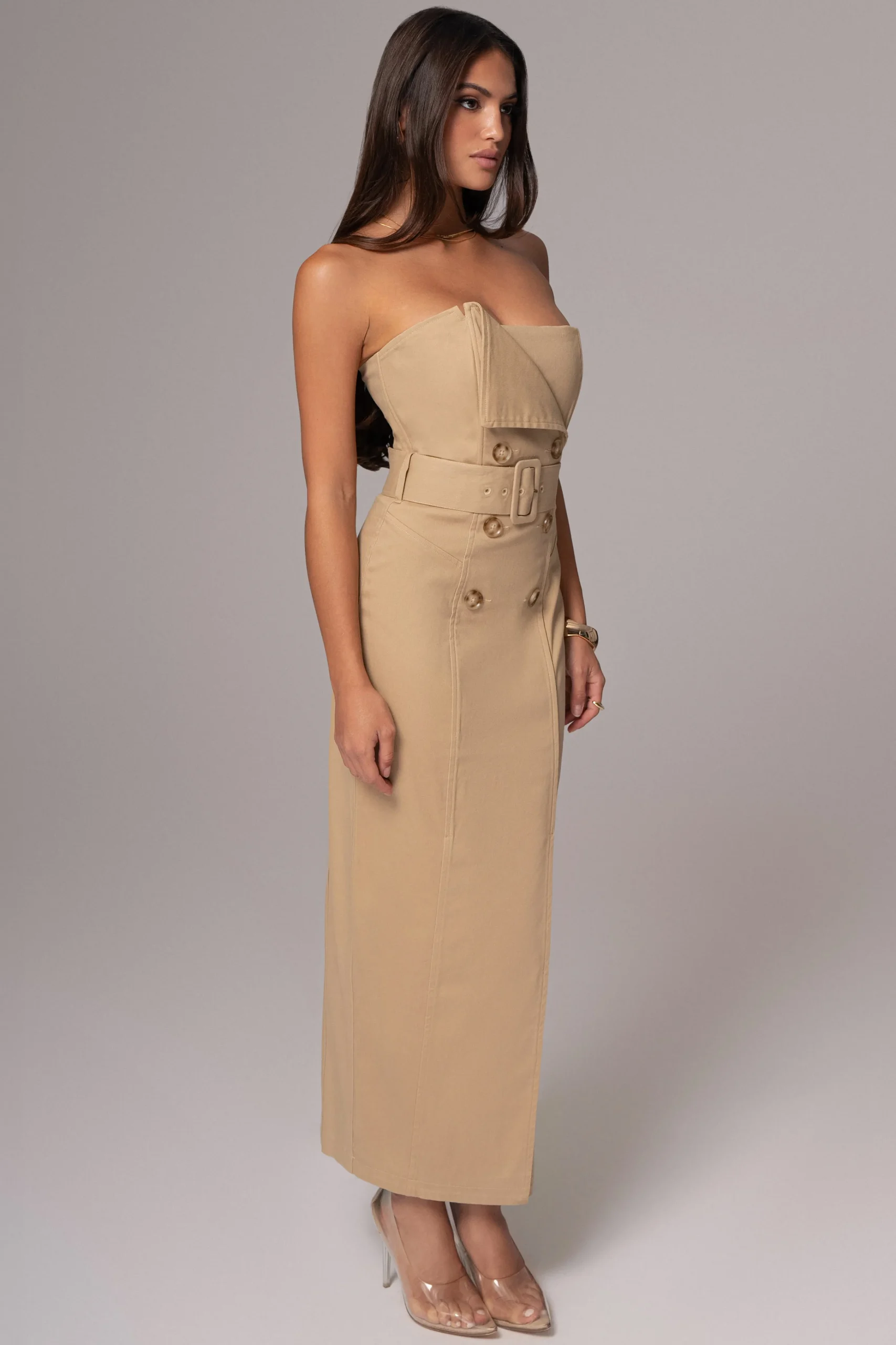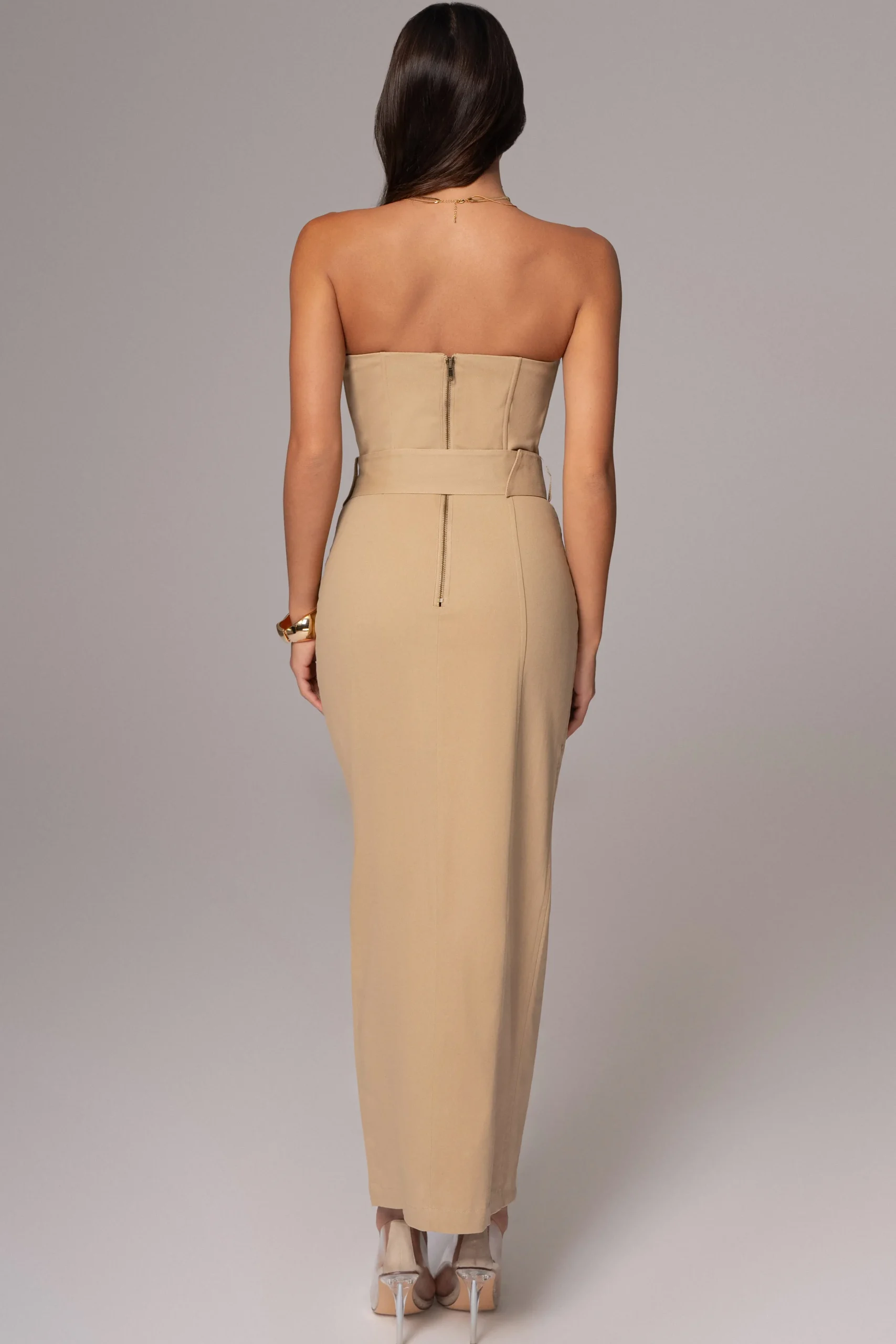 Redefine power dressing with our Khaki Strapless Belted Midi Dress. This stylish midi dress features a strapless neckline, boning for structure, and faux double-breasted design for a touch of elegance. Complete with a matching belt that cinches at the waist, a half-lined interior, and a back zipper closure. No stretch.