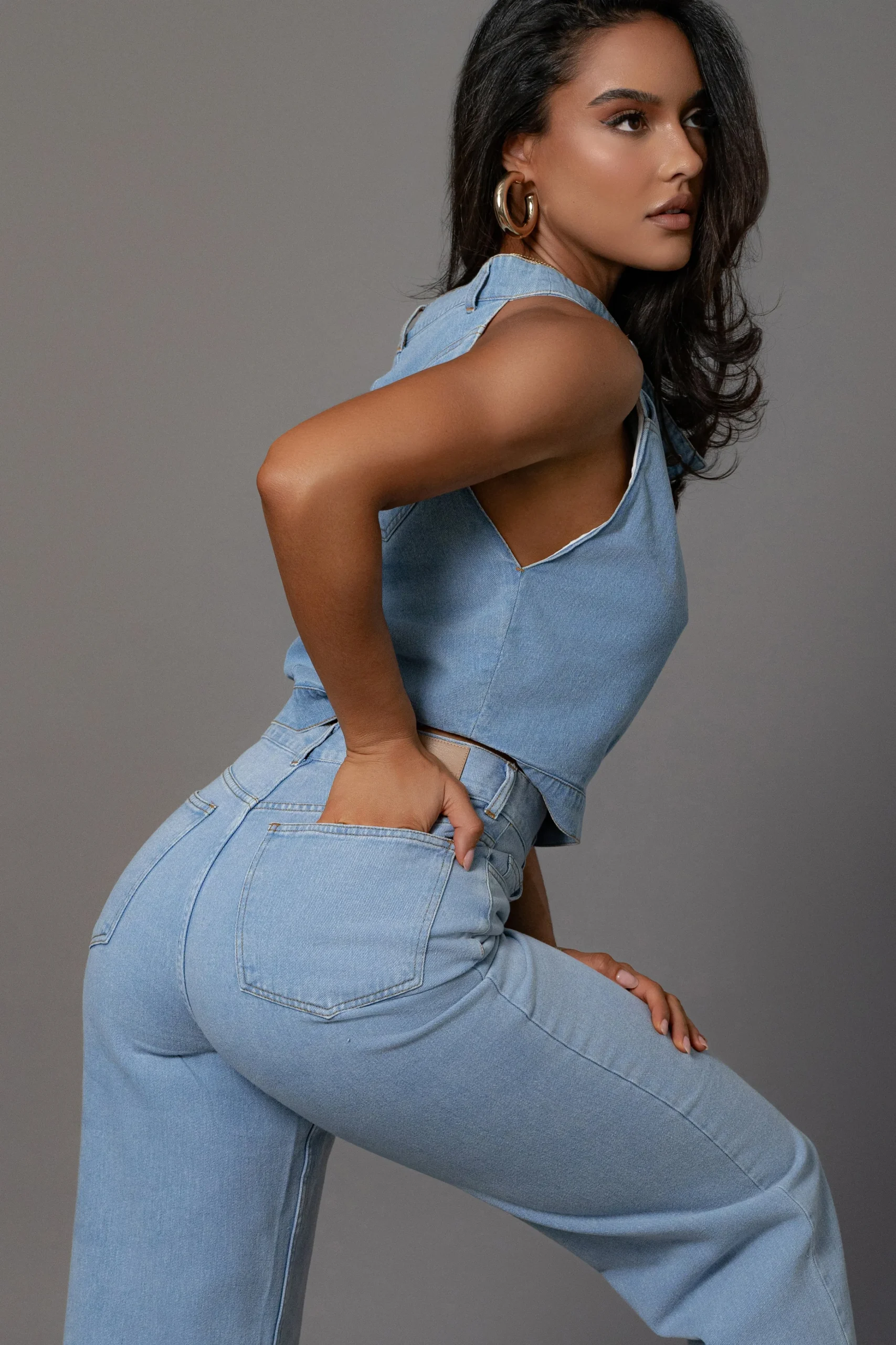 Our new Medium Wash Denim Aline Jeans are sure to become a year-round essential. Adorned with a Jluxlabel back tag, our newest Denim jeans showcase a straight-leg hem with a zip fly/button closure and the timeless five-pocket layout. Created in a light denim wash, these jeans exude classic appeal. Pair with our Denim Britney Corset for the full look. No stretch.