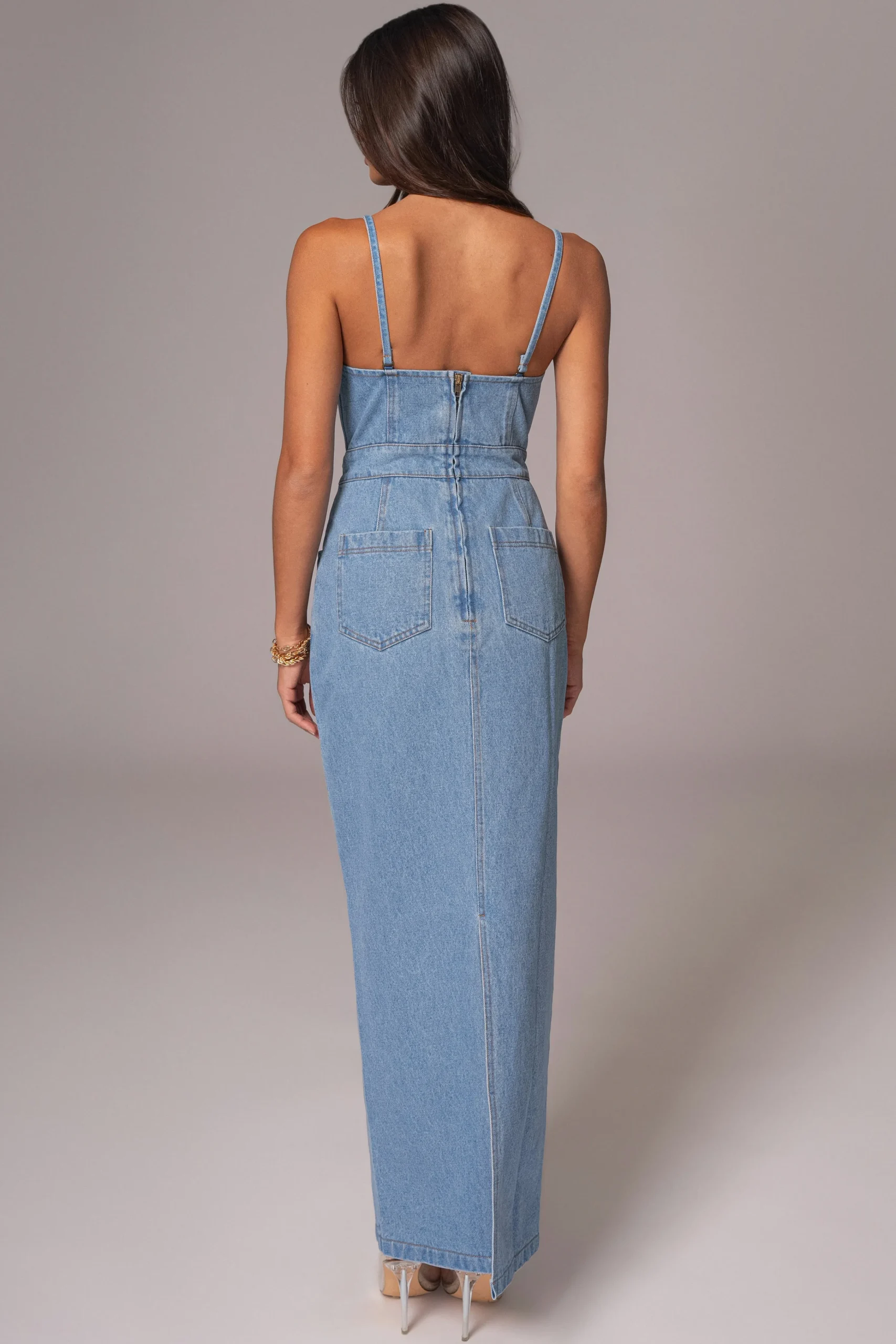Experience denim refinement with our Medium Wash Mara Denim Bustier Dress. This denim bustier-inspired dress features adjustable and removable shoulder straps for a customizable fit, as well as a built-in bra padding for added support. With functional front and back pockets and a back zipper closure, this dress achieves both style and function. Back slit hem. Single lined. No stretch.