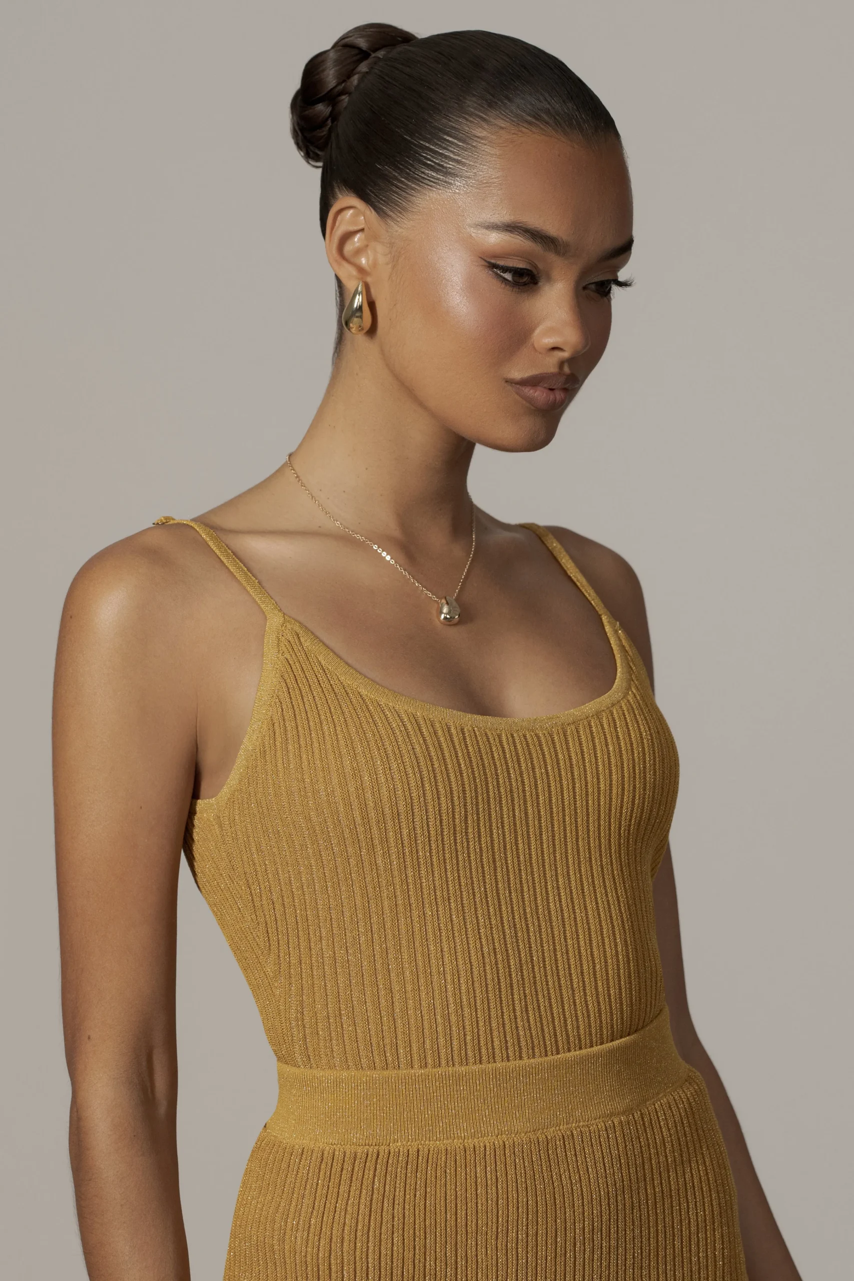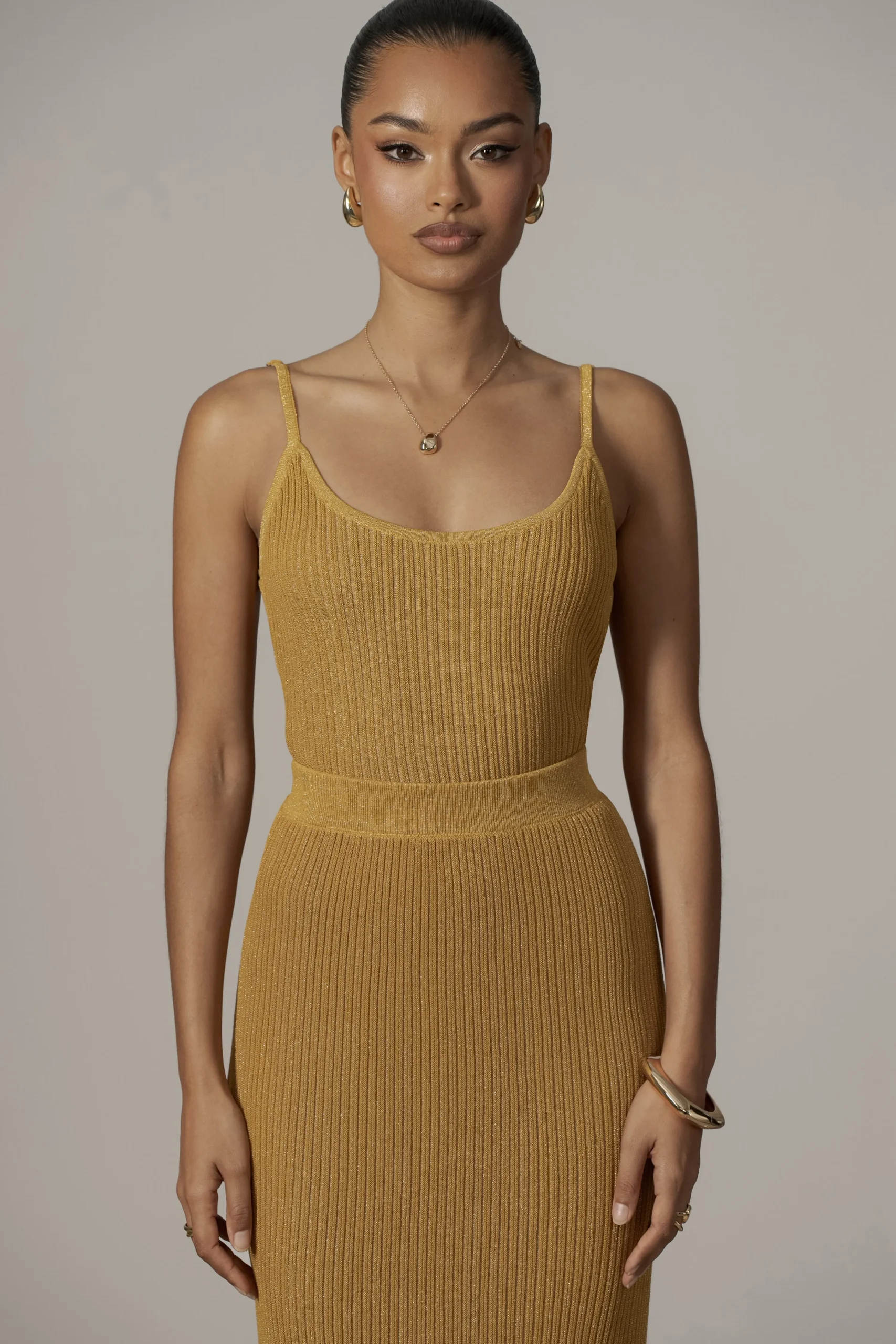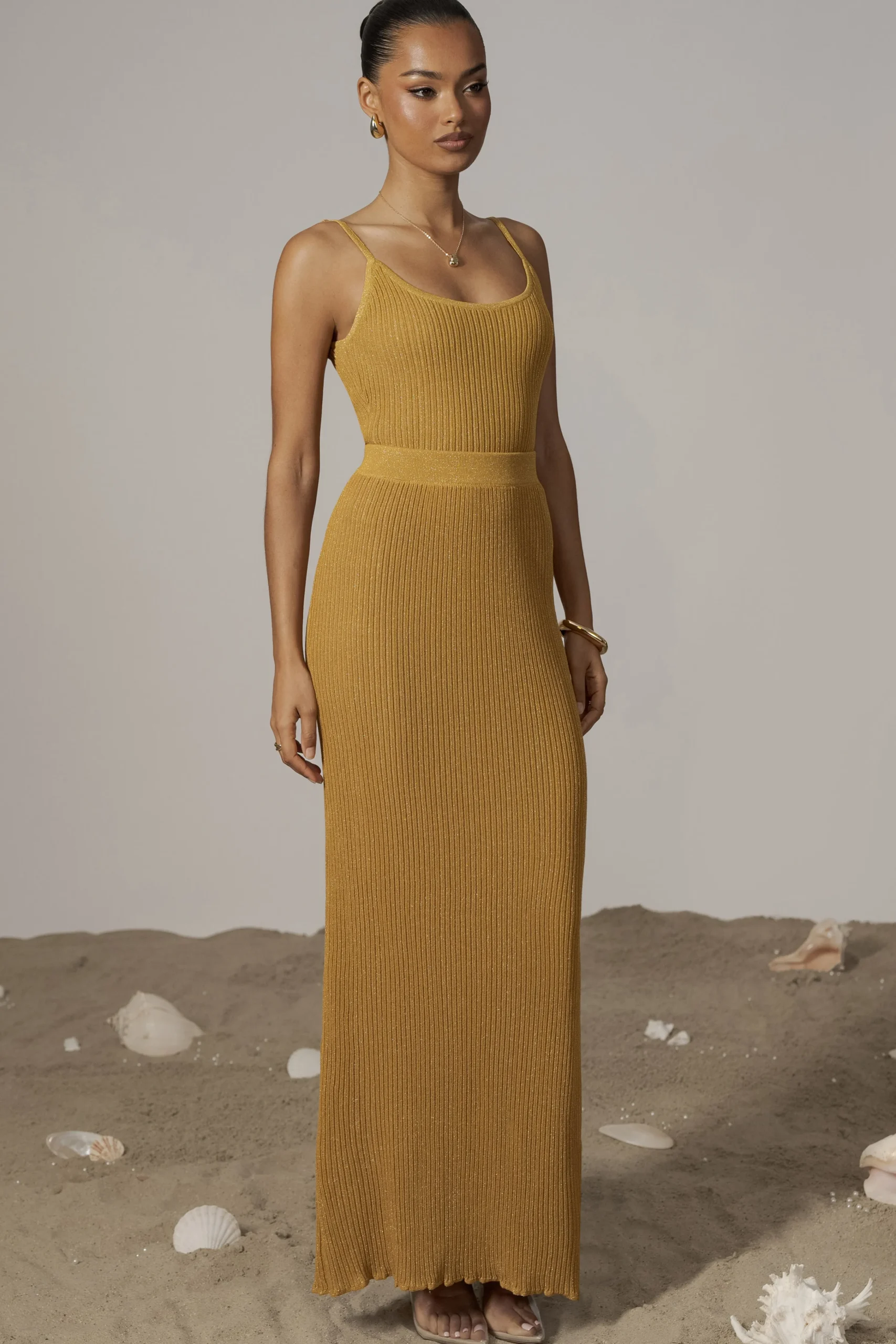 Get set for your next vacation with our Mustard Serena Ribbed Skirt Set. Crafted from a shimmery ribbed knit, this two-piece skirt set features a classic cami top with scoop neckline and adjustable shoulder straps. The matching skirt comes in a fitted silhouette with elastic waistband and midi hem. Stretchy. Double lined. Sold as set.