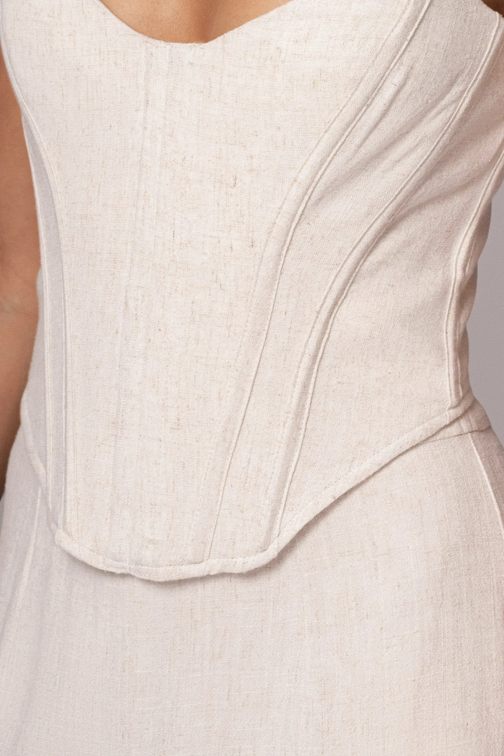Dive into the essence of summer with our Natural Beyond The Sea Linen Corset. This exquisite piece features a double-lined design and a curved hem, enhanced with boning for impeccable structure. The lace-up back ties add a touch of elegance, while the premium linen blend fabric exudes sophistication. No stretch.