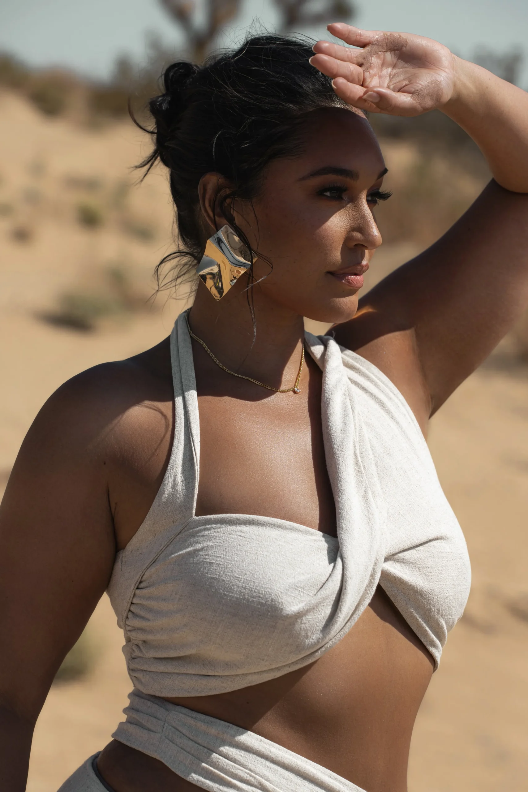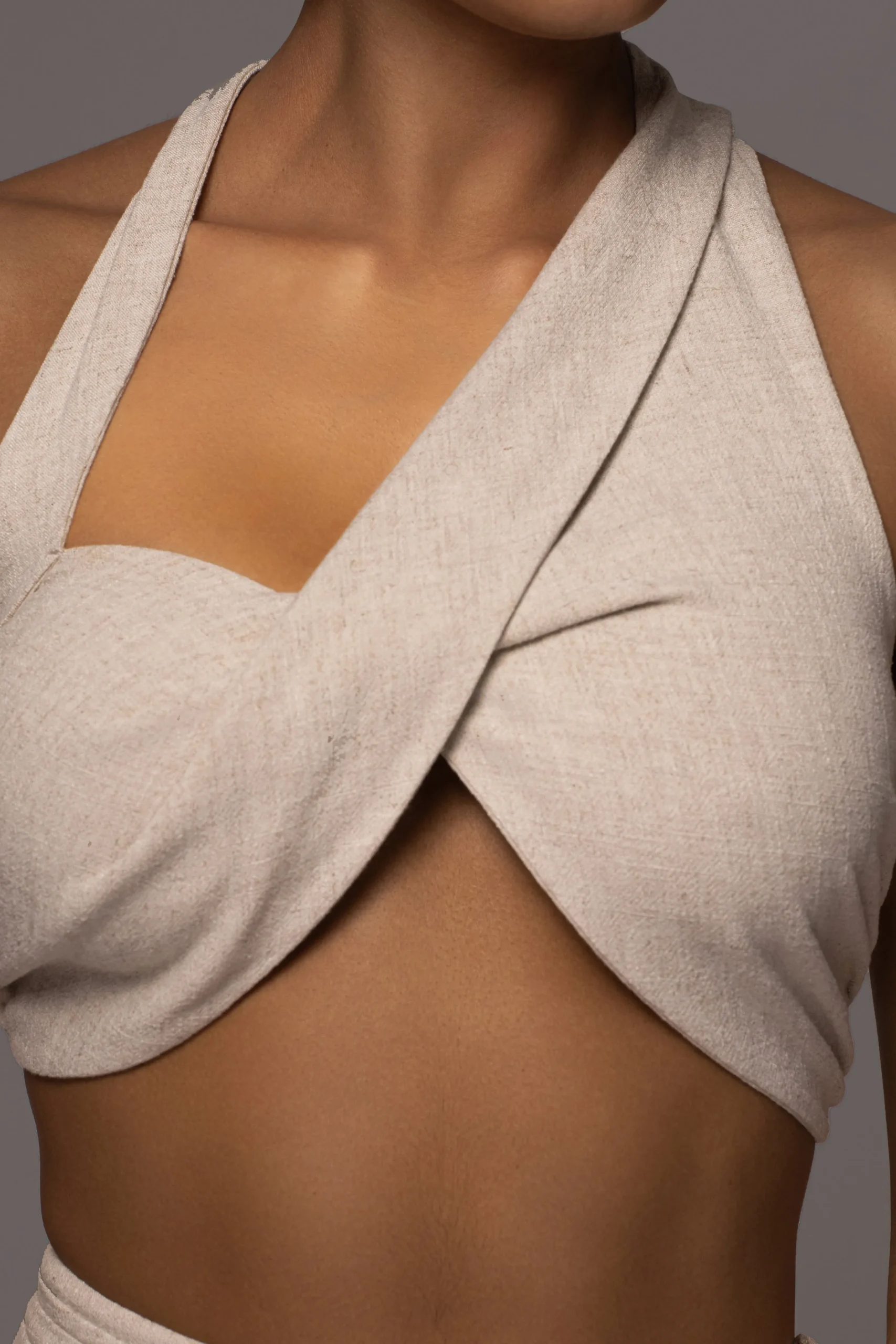 Step into a heavenly state with the Natural New Age Two Piece Skirt Set. This breathable skirt set elevates elegance in a crossover halter top baring an open back with a stylish back tie closure. The matching skirt comes in a classy maxi hem detailing a sensual thigh slit and a cutout at the waist. Perfect for summer’s most formal occasions. Sold as set. Double lined.
