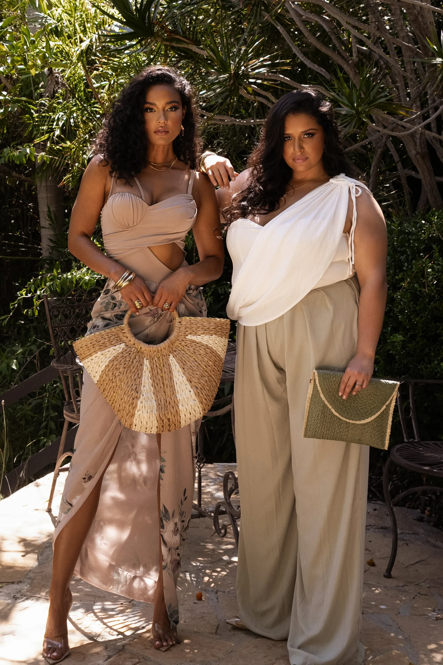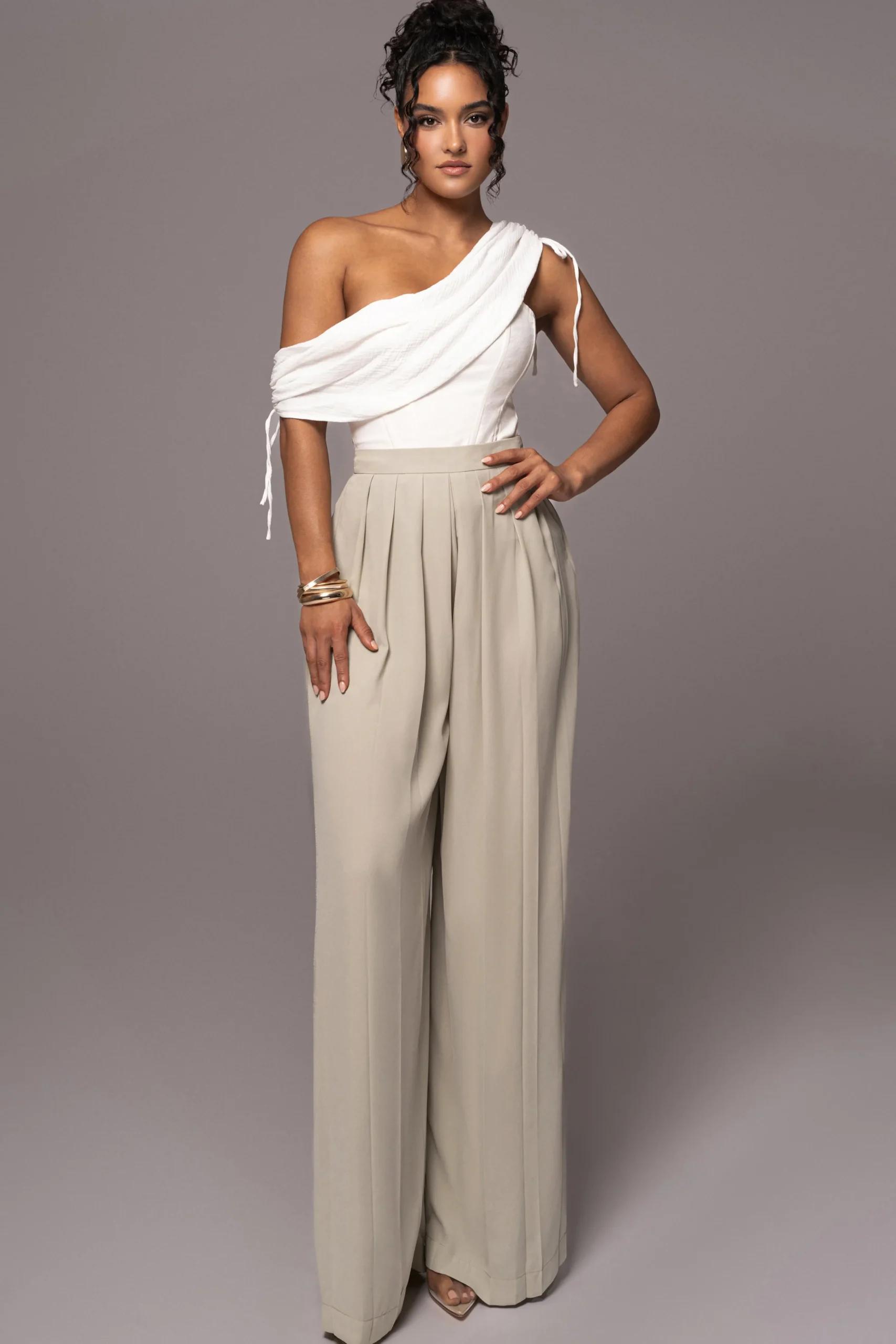 Live effortlessly elegant this summer in our Ivory New Obsession Draped Top. Crafted from premium materials, this statement piece features a sweetheart neckline with one shoulder design detailing a graceful drape for an unmistakable touch of sophistication. The built-in corset and boning provide superior structure and a sensational fit. The draped piece is removable for 2 looks in one. Pair with our Josette Wide-Leg Pleated Pants for the full look. Side zipper closure. Lined interior. Minimal stretch.