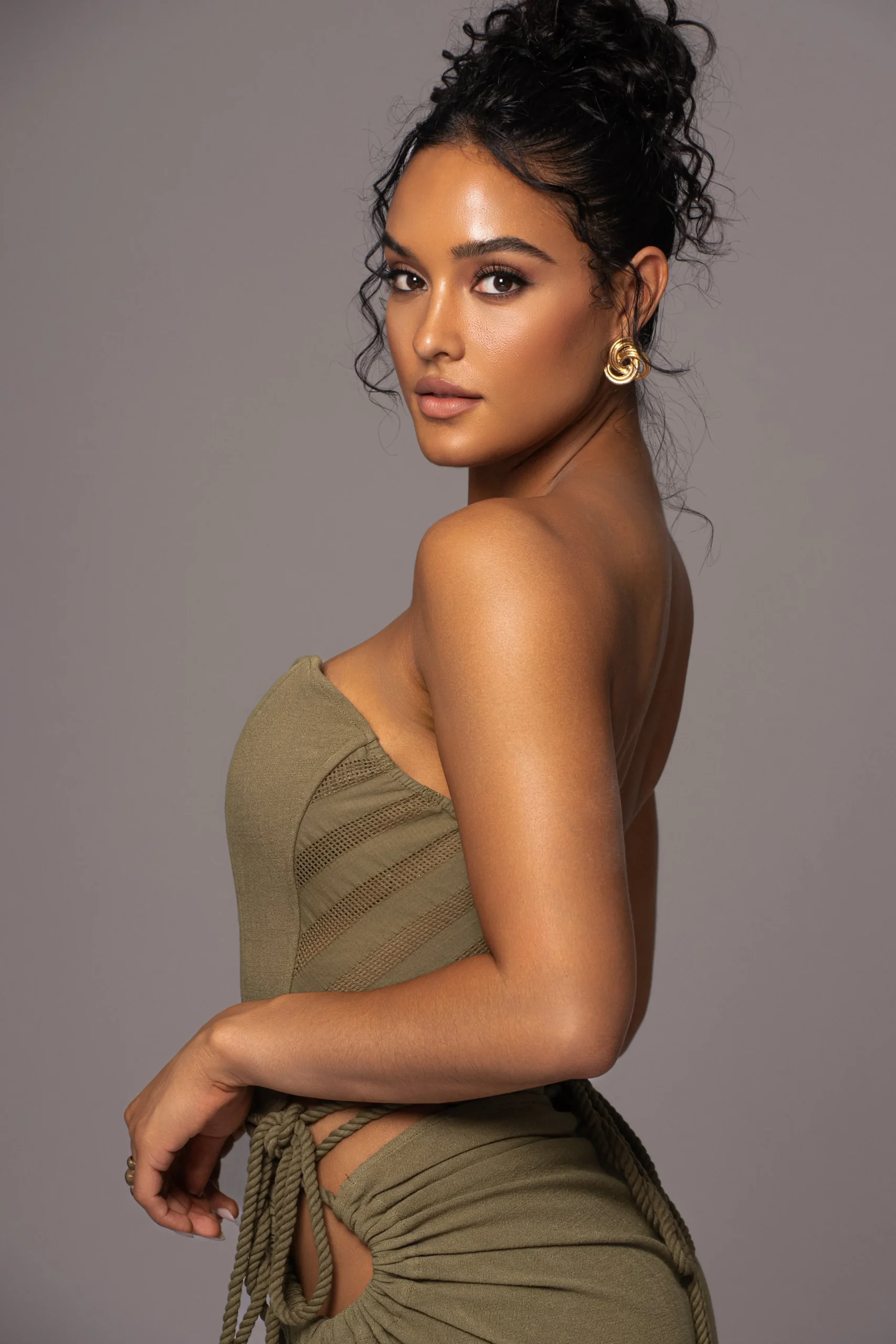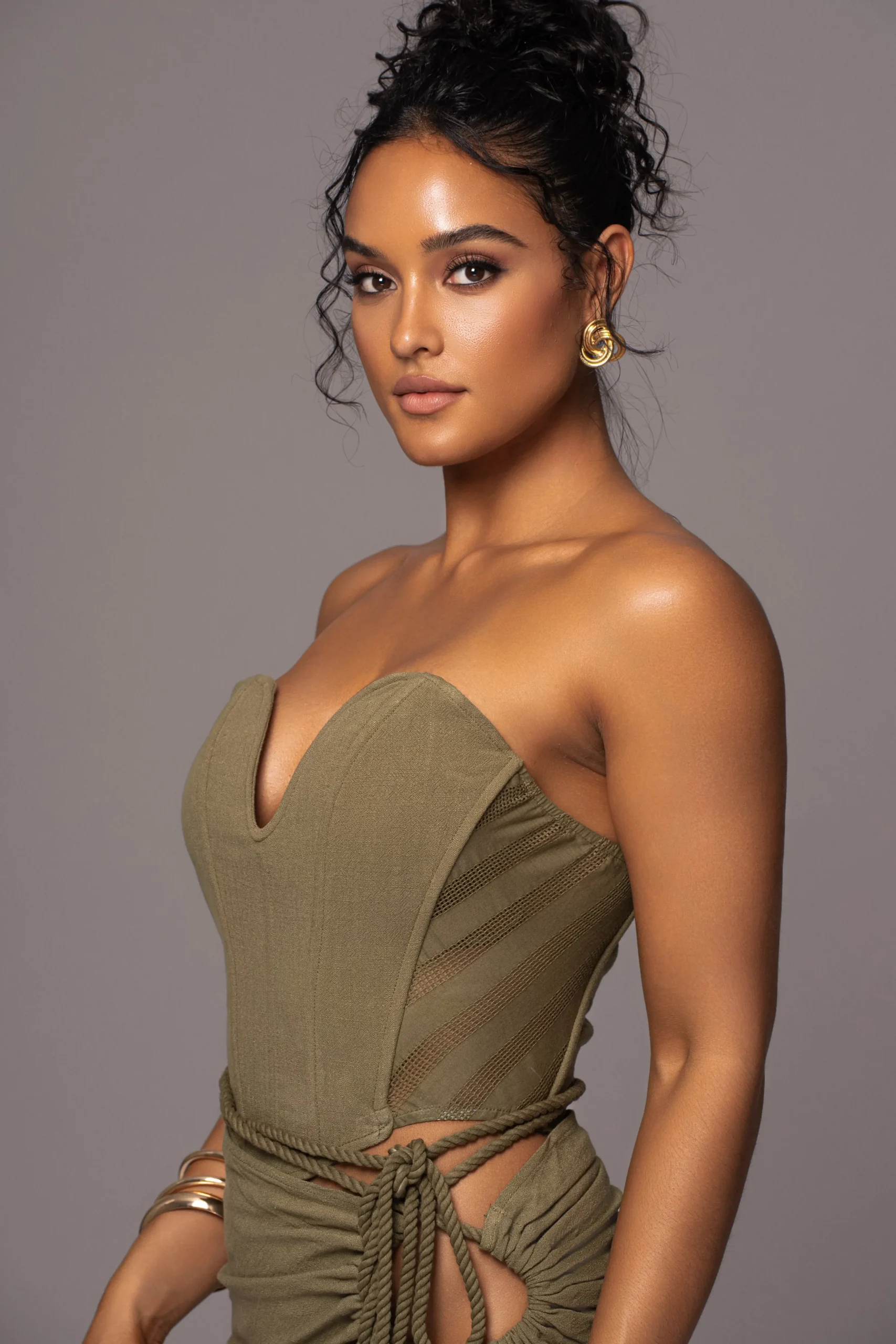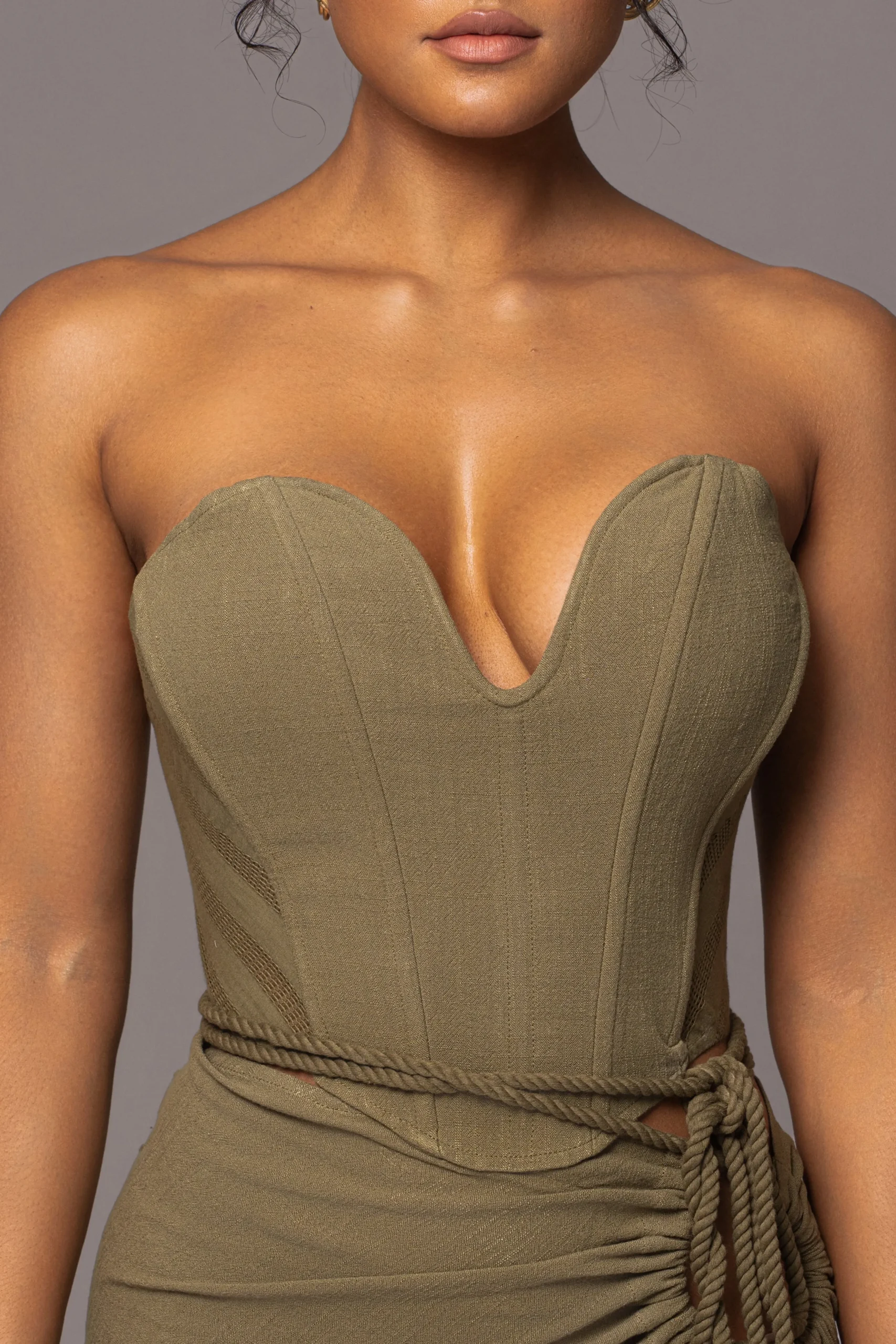 Explore a new kind of linen with our Olive Destination Linen Skirt Set! This captivating skirt set features a strapless corset with boning for structure and a stunning lace-up back with rope tie closures. The matching skirt stuns in a maxi hem with a rope tie waist and a side cutout. Crafted of our highest linen blend with a double lined finish for premium quality and fit. No stretch. Sold as set.