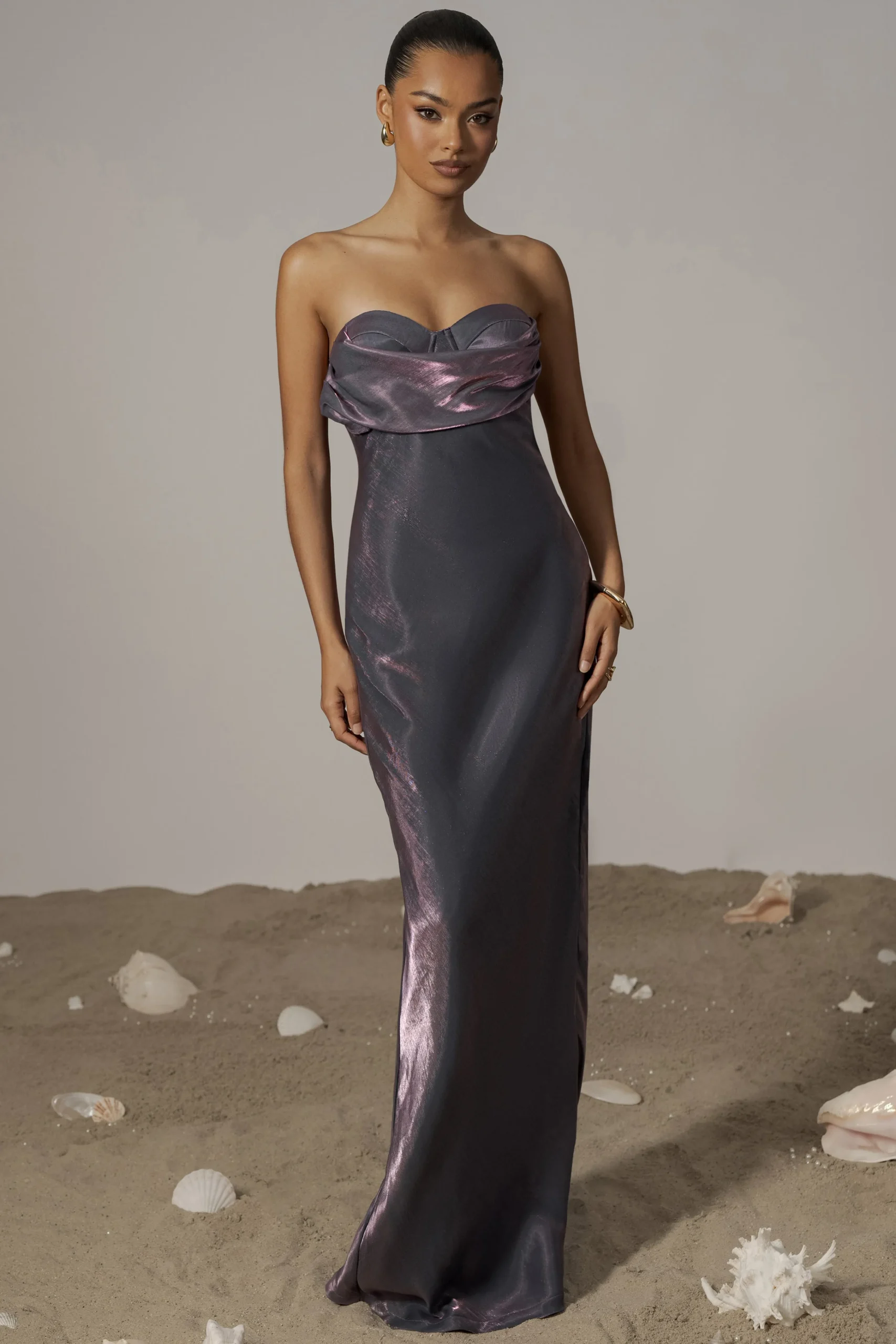 Our Purple Iridescent Visions Of You Midi Dress is a statement on its own. We’ve taken one of our most loved designs and reimagined it in radiant iridescent fabric, elevating its allure. Featuring a sweetheart neckline with cowl detail, padded/wired cup support, and elegant gold-tone straps that can be removed for an optional strapless look. Side zipper with slit hem. Double lined. Minimal stretch.