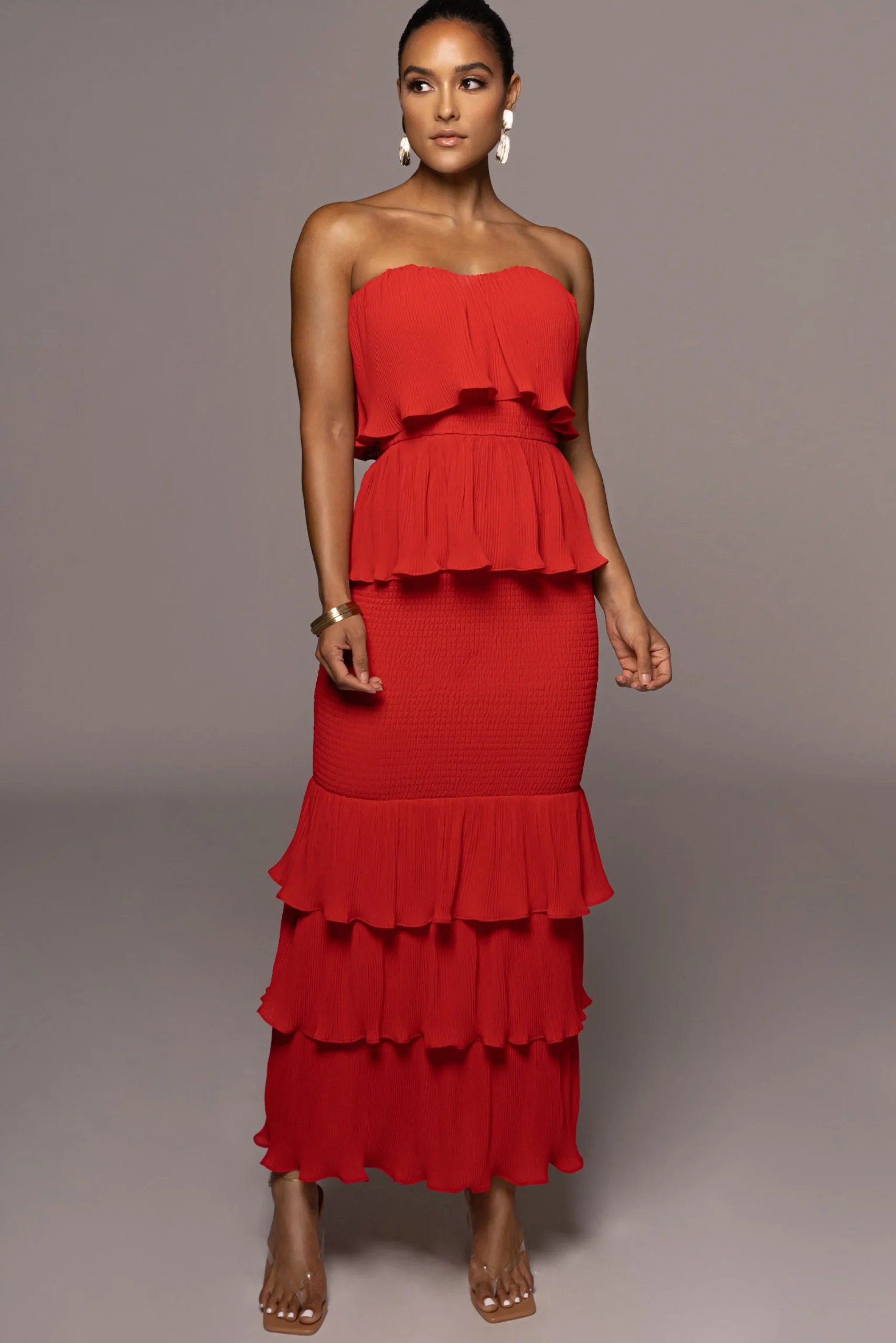EXCLUSIVELY DESIGNED BY US FOR YOU. Perfection is an understatement when dressed in the RED CASA BLANCA RUFFLE DRESS. This lovely maxi dress showcases a strapless neckline with ruffle trim, a smocked lower waist, and flattering ruffled tiers throughout. Interior lining. Slip-on style. Stretchy.
