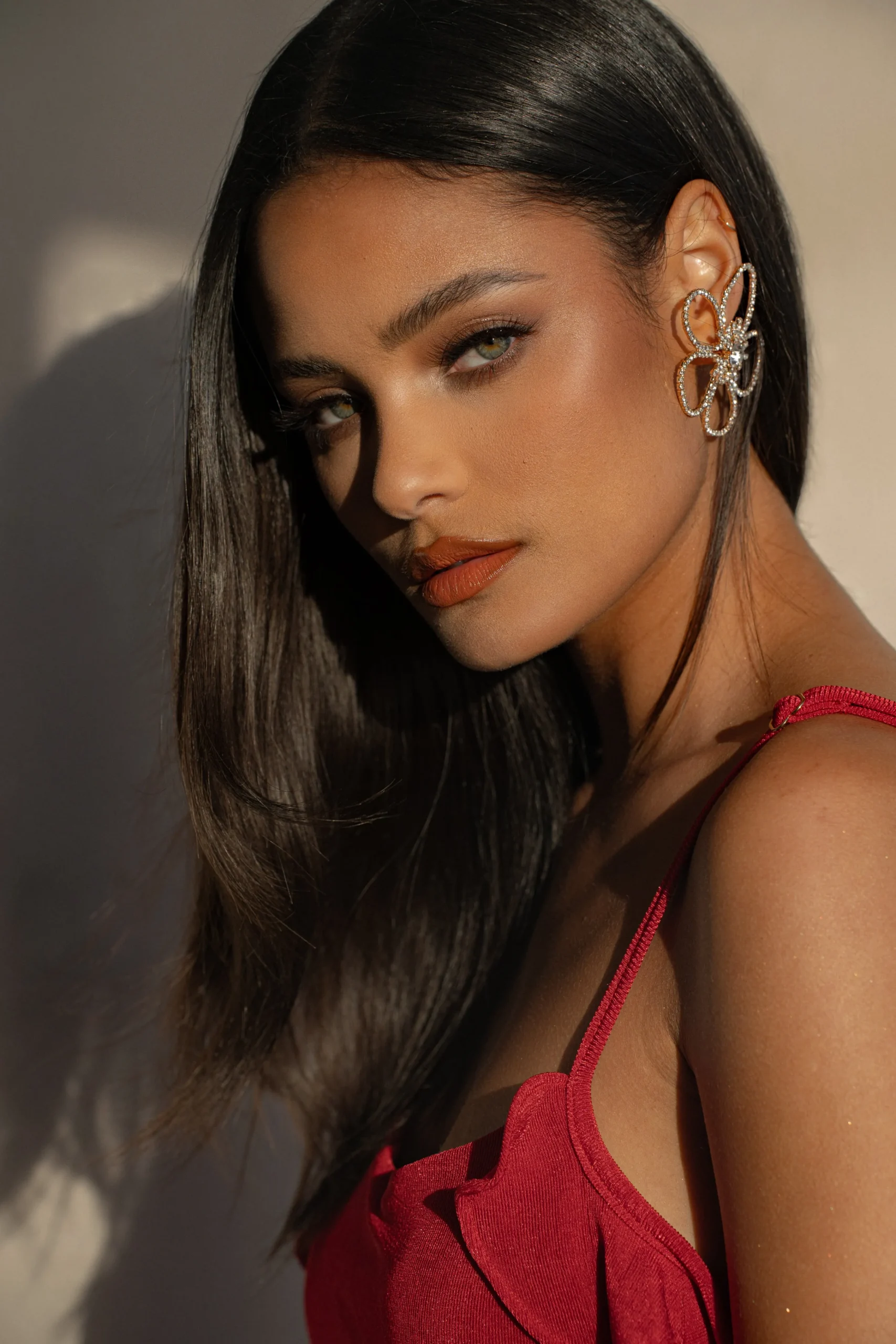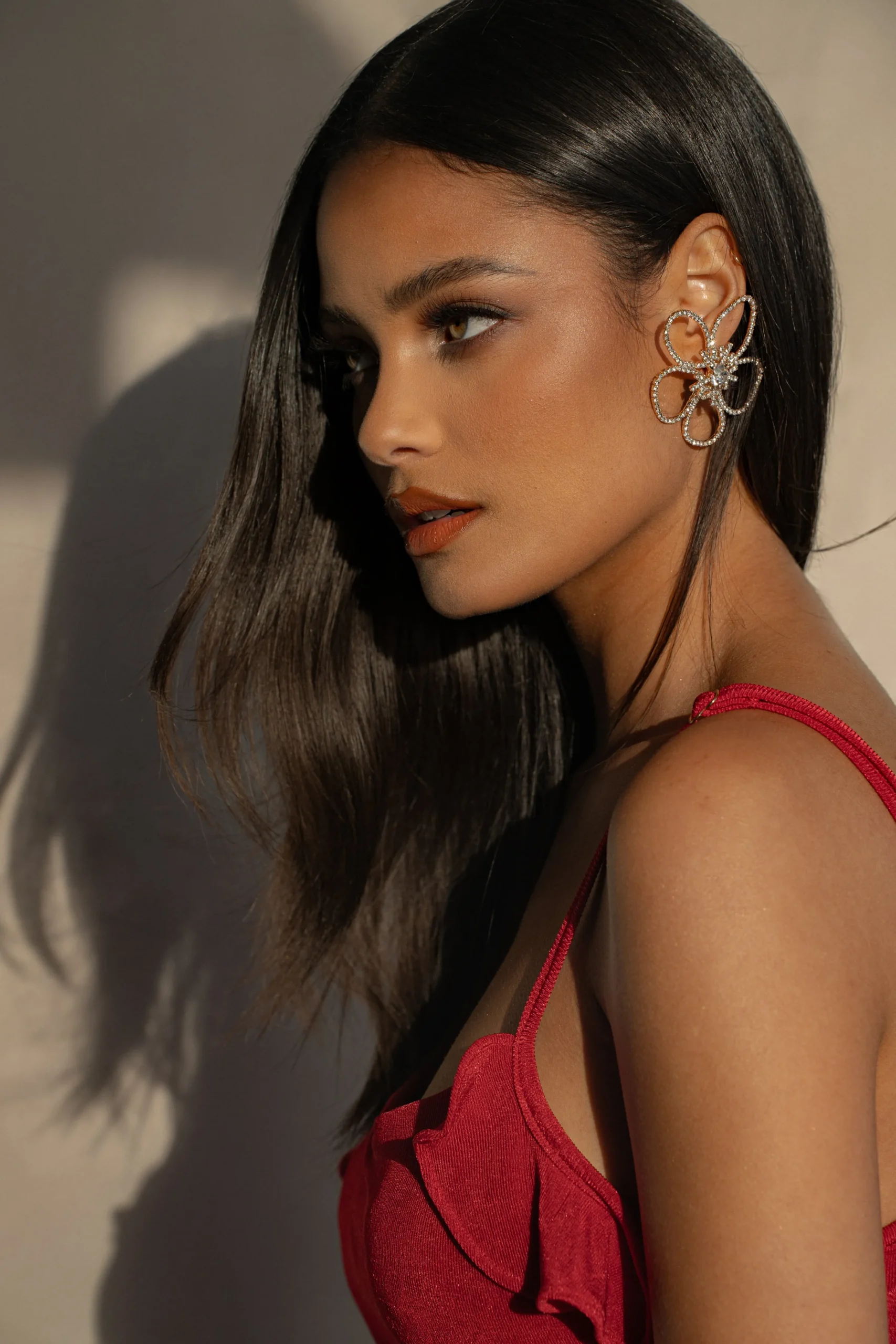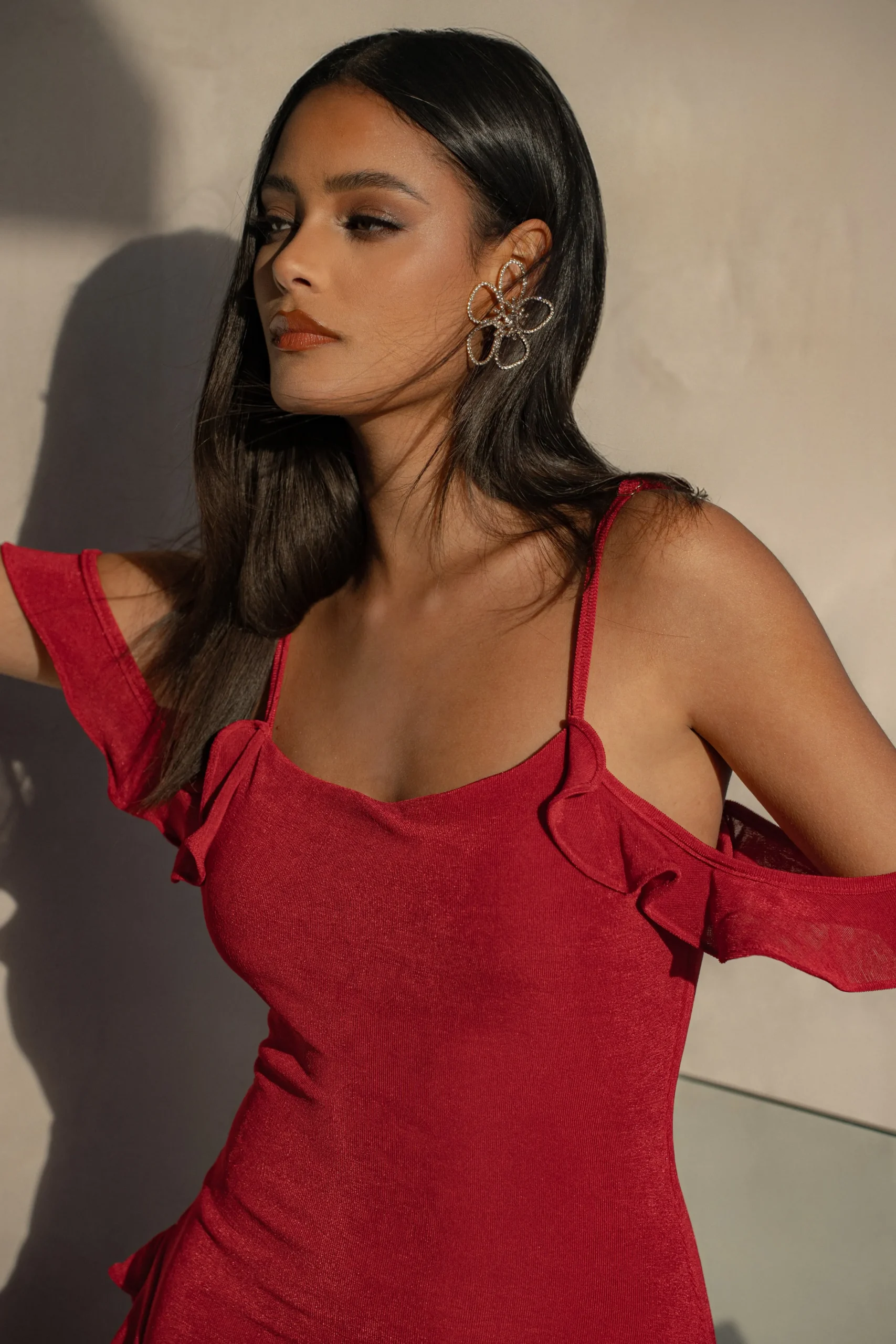 Add a pop of color to your next event with our Red Maude Maxi Dress. This lovely maxi dress features adjustable cami straps with stylish ruffles off the shoulder and throughout the design. Crafted from a slinky double-lined fabric for extra stretch and quality. Stretchy.