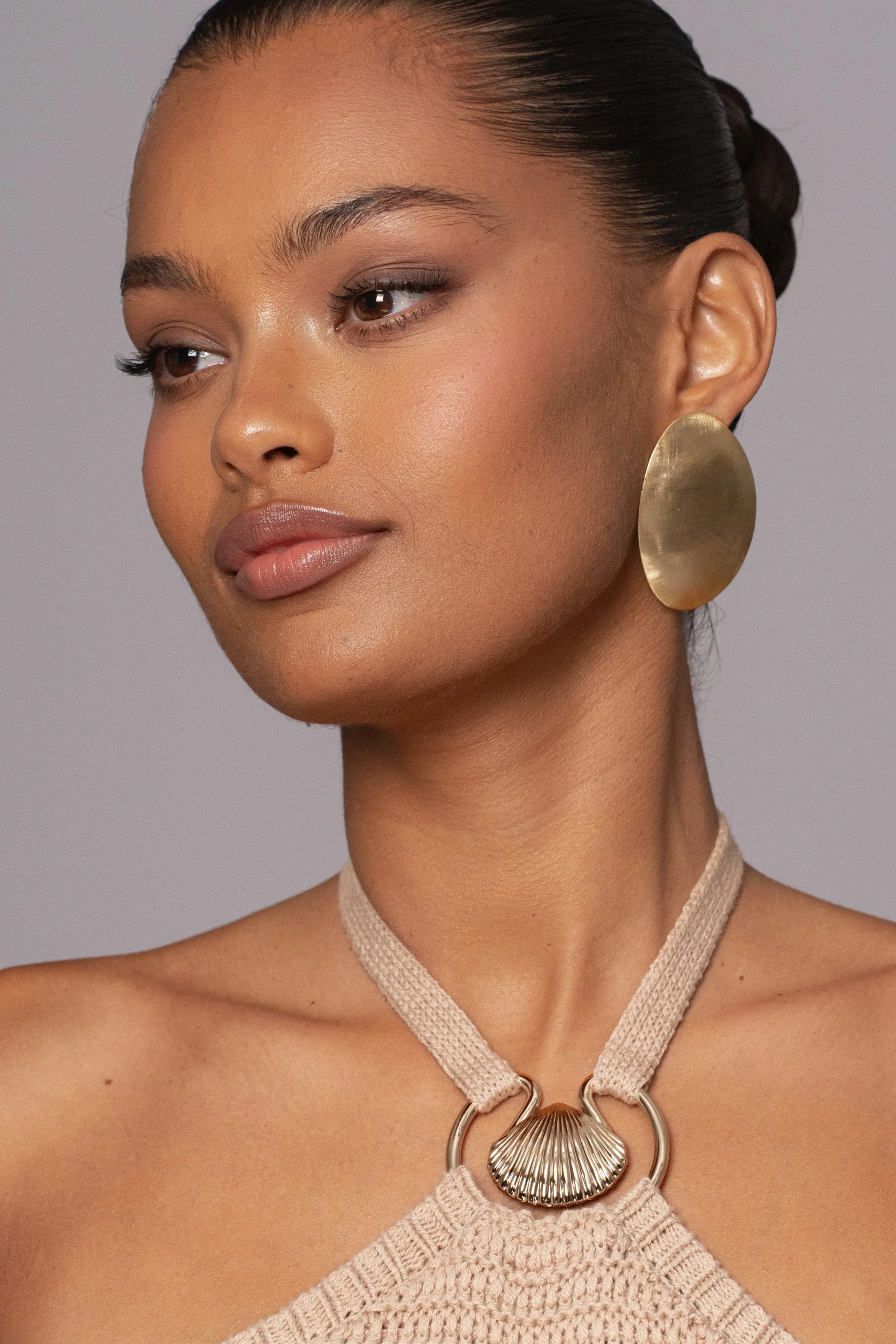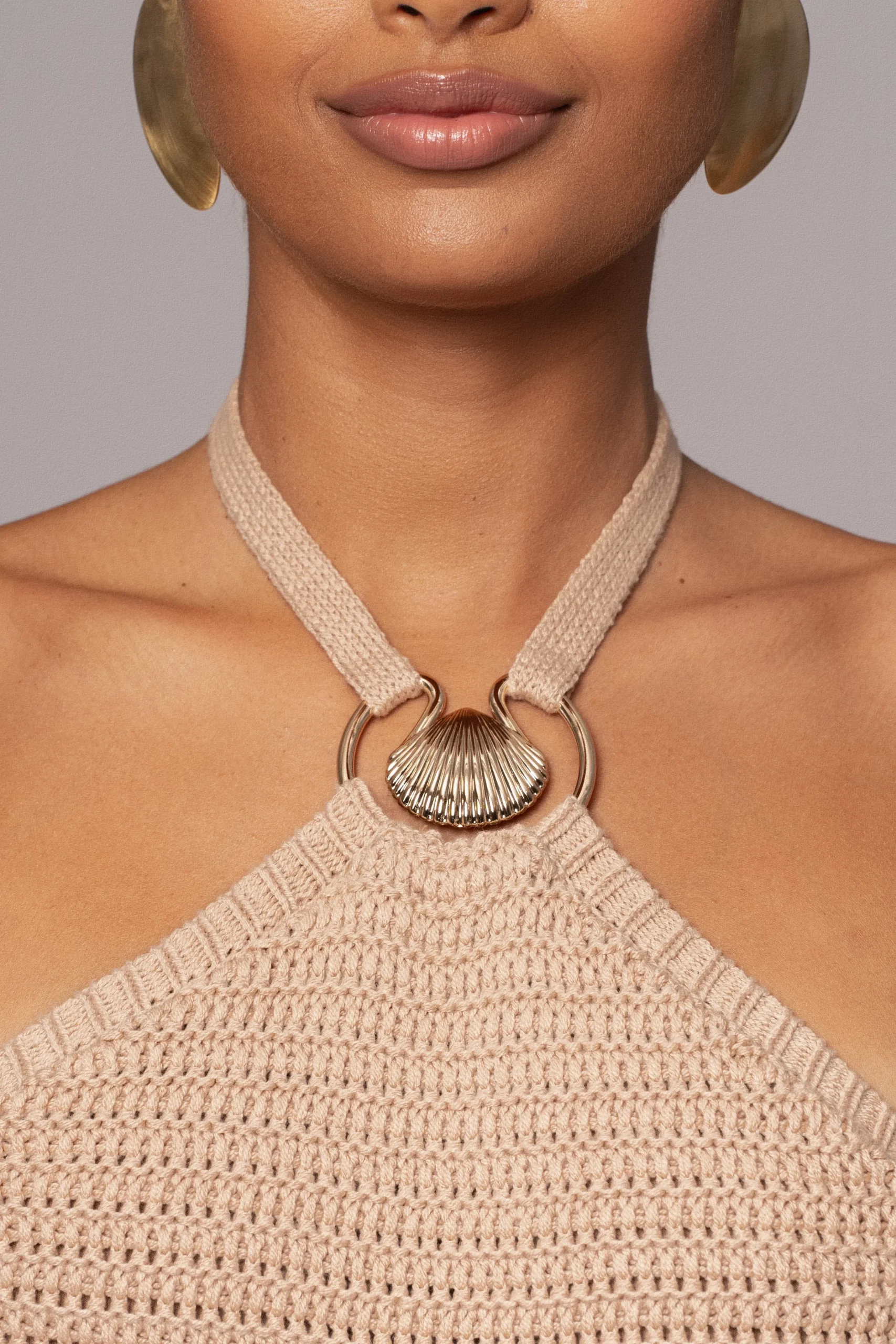 Achieve summer elegance with our Sand Overseas Halter Maxi Dress. This stunning dress features a halter neckline adorned with a golden seashell accent and back ties, adding a touch of sophistication to any look. Crafted from breezy crochet knit fabric, it’s perfect for all your warm-weather adventures. Stretchy. Double lined.