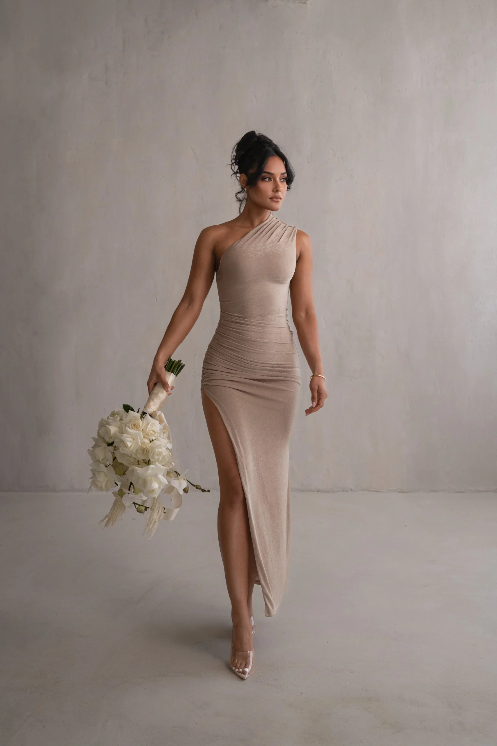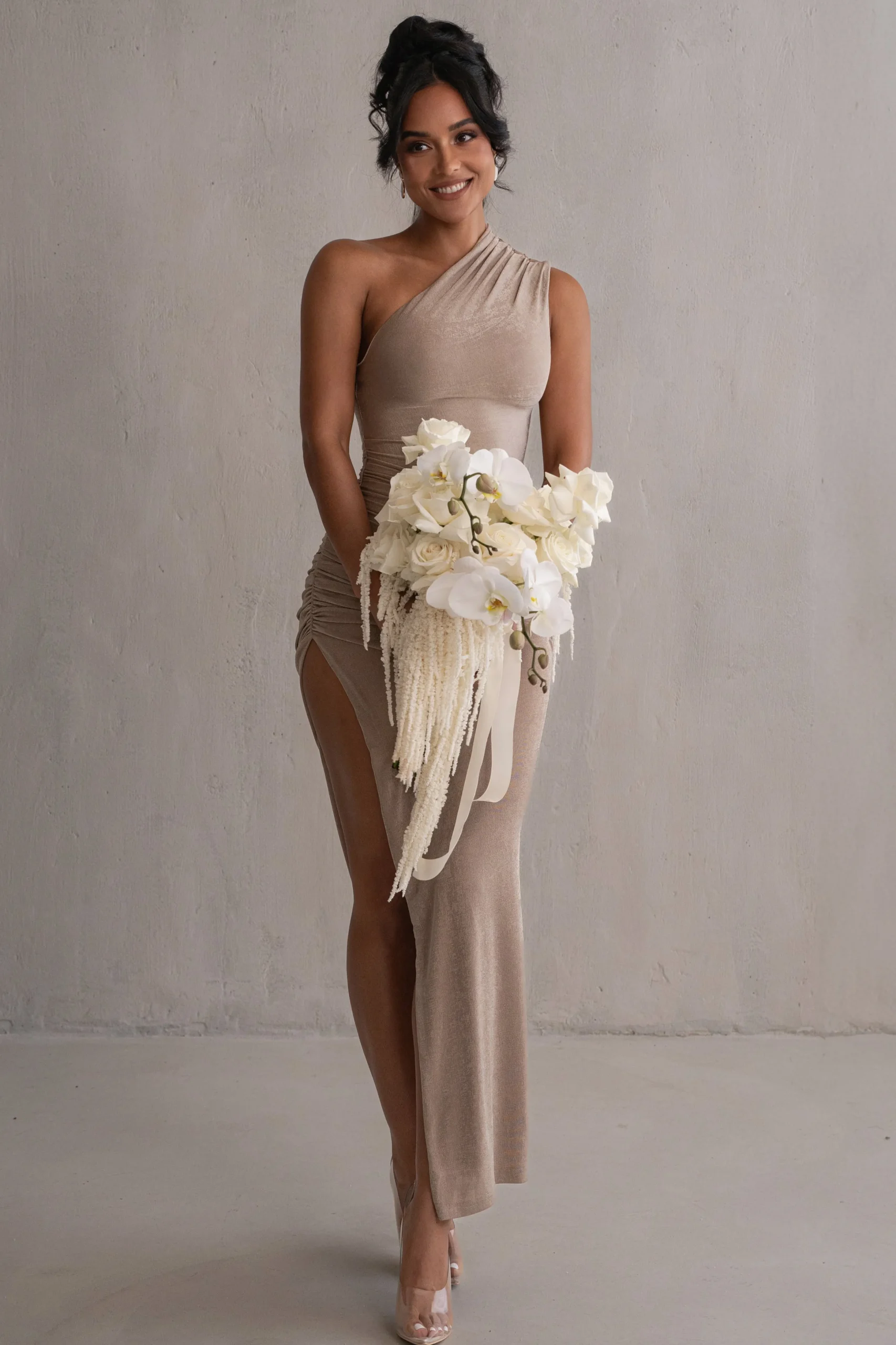 Designed for the JLUXLABEL Bridal Collection. Our Taupe Eden One Shoulder Maxi Dress serves timeless glamour. Featuring a one-shoulder neckline in a fitted silhouette with slight ruching at the shoulder and waist. A slide slit adds extra charm. Constructed in a stretchy slinky fabric offering a flexible fit. Double lined.