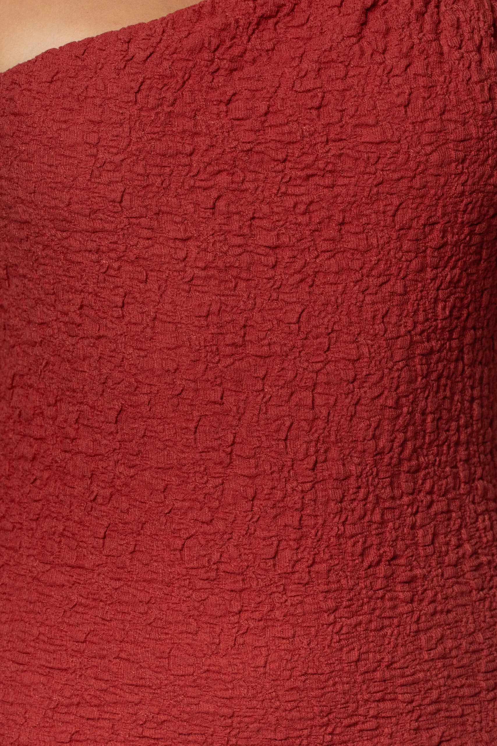 Our new Terra Cotta Summer In Capri Dress is perfect for your summer getaway. Crafted from lightweight crinkled fabric, it features a unique wooden keyhole at the shoulder and removable wooden chain straps. Hidden back zipper closure. Minimal stretch.