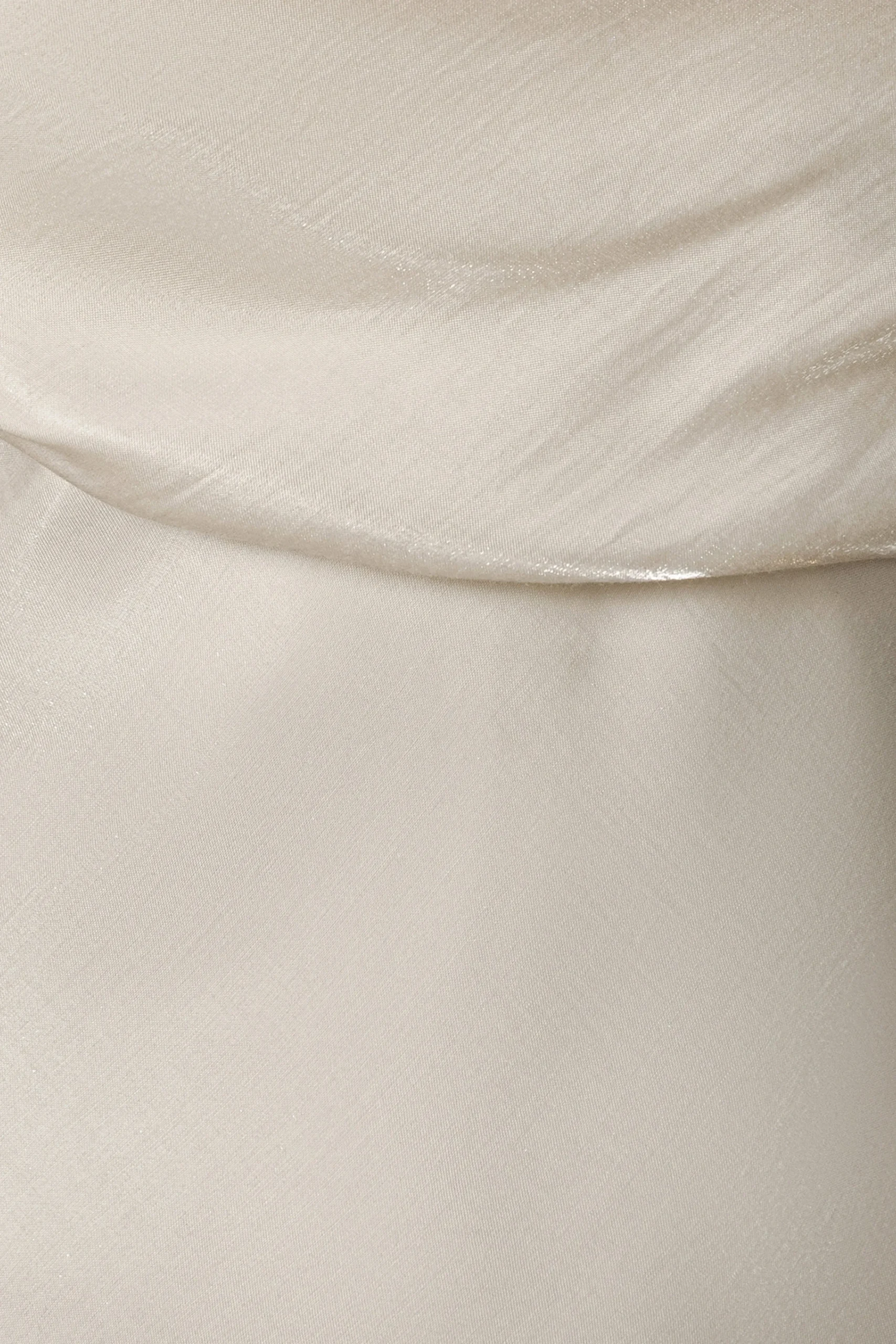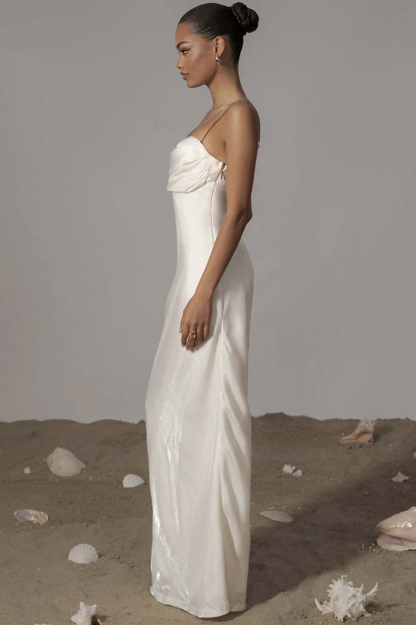 Our White Iridescent Visions Of You Midi Dress is a statement on its own. We’ve taken one of our most loved designs and reimagined it in radiant iridescent fabric, elevating its allure. Featuring a sweetheart neckline with cowl detail, padded/wired cup support, and elegant gold-tone straps that can be removed for an optional strapless look. Side zipper with slit hem. Double lined. Minimal stretch.
