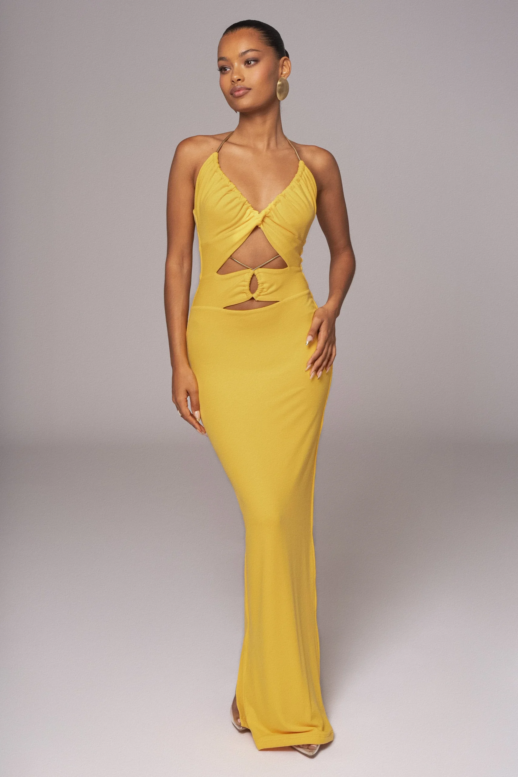 Experience the height of elegance with our Yellow Secret Bloom Maxi Dress. This halter dress features a halter neckline with elegant gold-tone trims and waist cutouts, adding a touch of luxury to your look. Back slit hem.